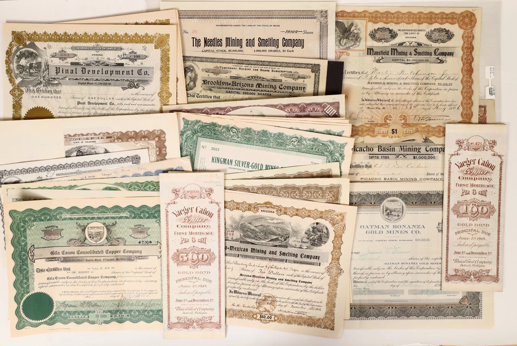 Lot of 32. Includes: Gila Canon Cons. Copper Co. (1917); Brooklyn-Arizona Mining Co. (1911); Needles Mining & Smelting Co. (1913); United Western Mines Corp. (1924); Monster Chief MC (1916); Copper King of Arizona (1900); United Eastern Mines Corp. (5, 1931); Arizona-Mexican Mining & Smelting Co. (1906 and uniss.); Oatman Apex MC (1916); Oatman Bonanza GMC (1916); Bagdad Copper Corp. (1927); Kingman Silver-Gold Mines Co. (6 uniss.); Yaeger Canon Copper Co. (2 bonds, 1903); Bonanza MC (1948); Picacho Basin MC (1908); Mansfield Mining & Smelting Co. (1906); Mildred Gold MC (2, 1917); and Pinal Development Co. (3 uniss.).