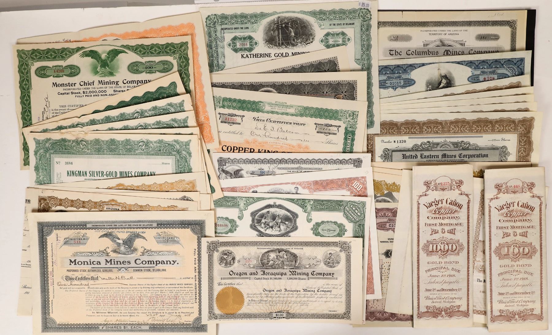 Lot of 36. Includes: Mildred Gold Mines Co. (1915 & 1917); United Eastern Mines Corp. (5, 1931); Bagdad Copper Corp. (1928 & 1929); Katherine Gold Mining Co. of Delaware (1929); Oregon & Joraquipa MC (uniss.); Columbus Mines Co. (1914); Monica Mines Co. (1908); Mountaineer Mines, Cons. (uniss.); Arizona-Mexican Mining & Smelting Co. (1905 plus 2 uniss.); Gila Canon Cons. Copper Co. (1917); Kingman Silver-Gold Mines Corp. (5 uniss.); Western Apex MC (1926); Monster Chief MC (1916); Yaeger Canon Copper Co. (2 bonds, 1903); Calumet & Hecla, Inc. (1966); Callahan Mining Corp. (Specimen); Bonanza MC (1948); Oatman Apex MC (1916); Oatman Bonanza GMC (1916); Copper King of Arizona (1900); and Pinal Development Co. (3 unissued). Please inspect.