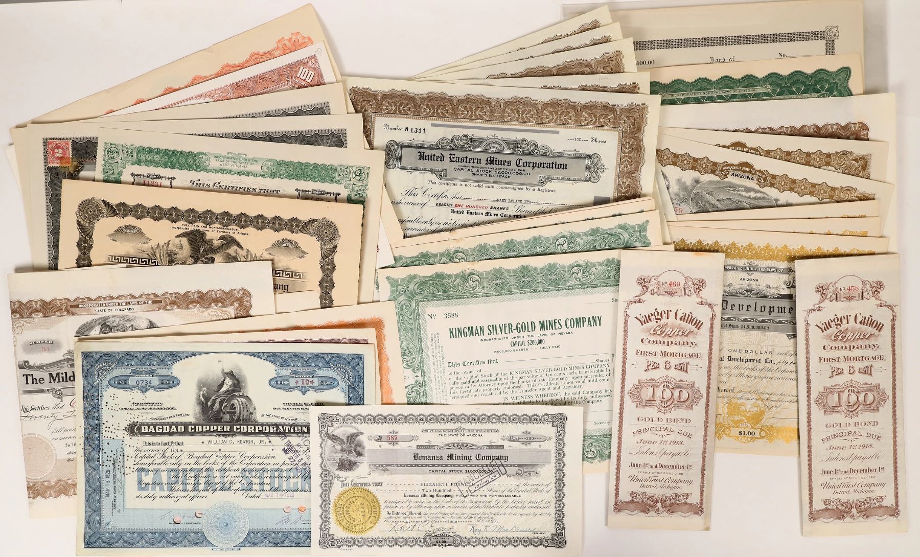 Lot of 33. Includes: San Bartolo Mining Company (1910); Gila Canon Cons. Copper Co. (1917); Mildred Gold Mines Co. (1914 & 1915); United Eastern Mines Corp. (5, 1931); Bagdad Copper Corp. (1928 & 1929); Buck Mountain Gold MC (uniss.); Confidence Mining Company (3 uniss.); Arizona-Mexican Mining & Smelting Co. (2 uniss.); Kingman Silver-Gold Mines Corp. (5 uniss.); Western Apex MC (1926); Yaeger Canon Copper Co. (2 bonds, 1903); Callahan Mining Corp. (Specimen); Bonanza MC (1950); Oatman Apex MC (1916); Oatman Bonanza GMC (1916); Copper King of Arizona (1900); and Pinal Development Co. (3 unissued). Please inspect.