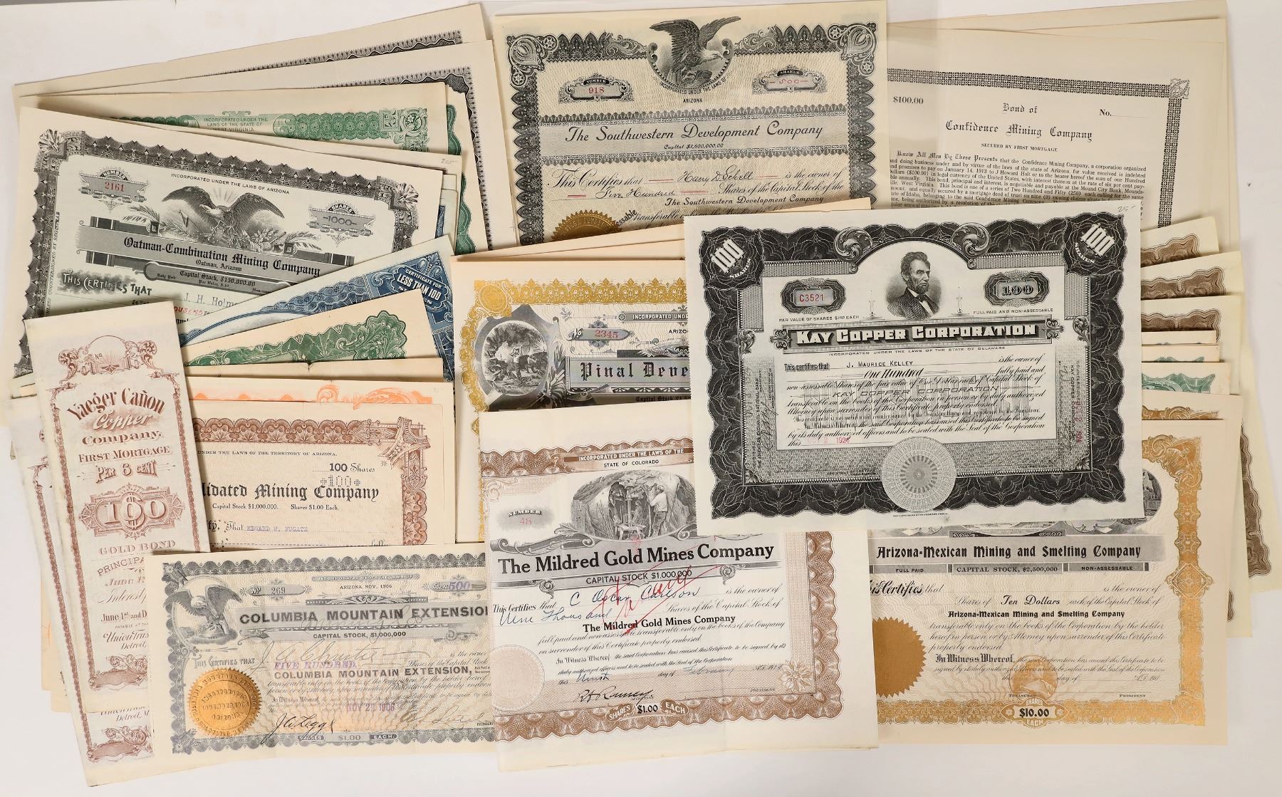 Lot of 38. Mix of issued and unissued. Includes: Magma Copper Co. (1925); Yaeger Canon Copper Co. (two 1903 bonds); Mildred Gold Mines (two, 1914); Columbia Mountain Extension (1906); Confidence Mining Co. (3 uniss.); Arizona Gold King MC (1920); Oro Grande Gold Mining Co. (1904); Arizona Victory Copper Mines Corp. (1931); Chief Cons. Mining Co. (1909); Oatman Bonanza Gold Mines Co. (1916); Oatman Apex MC (1916); Globe Dominion Copper Co. (1917); Copper King of Arizona (1900); Bagdad Copper Corp. (3 different, 1928-1929); Oatman-Combination Mining Co. (1922); Southwestern Development Co. (1907); Kay Copper Corp. (1924); United Eastern Mines Corp. (5, 1931); Kingman Silver-Gold Mines Corp. (5 uniss.); Arizona-Mexican Mining & Smelting Co. (2 uniss.); and Pinal Development Co. (3 uniss.).