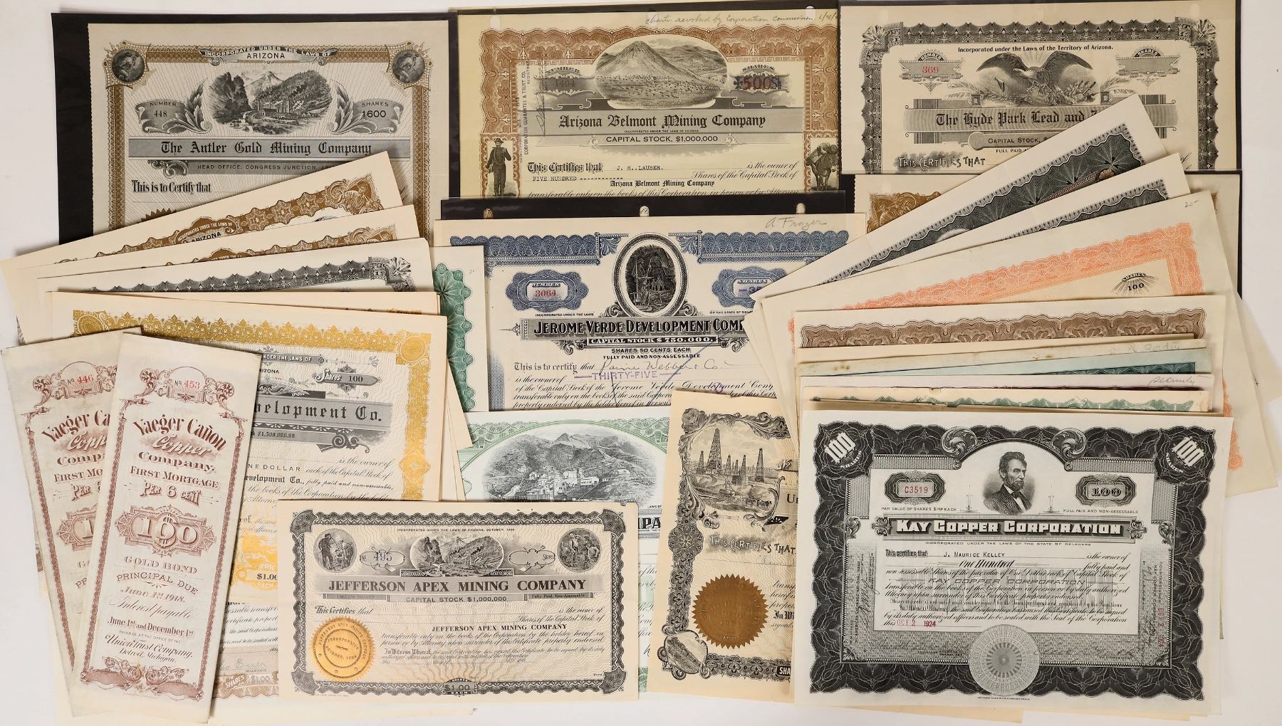 Lot of 32. Mix of issued and unissued. Lots of variety! Includes: Magma Copper Co. (1961); Mildred Gold Mines Co. (2, 1914); Yaeger Canon Copper Co. (two 1903 bonds); Union Cons. Refining Co. (1901); Magma Chief Copper Co. (1916); Jefferson Apex MC (uniss.); Jerome Verde Dev. Co. (1921); Arizona Copper Mountain Mining Co. (1901); Hyde Park Lead & Zinc Co. (uniss.); Arizona Belmont Mining Co. (1913); Antler Gold MC (uniss); Oatman Apex MC (1916); Oatman Bonanza Gold Mines Co. (1916); Wenden Copper MC (1929); United Eastern Mines Corp. (1931); Gila Canon Cons. Copper Co. (1917); Bagdad Copper Corp. (3 different, 1927-29); Kingman Silver-Gold Mines Co. (5 uniss.); Kay Copper Corp. (1924); Arizona-Mexican Mining & Smelting Co. (2 uniss.); Oatman-Combination Mining Co. (1922); and Pinal Development Co. (3 uniss.). Please inspect.
