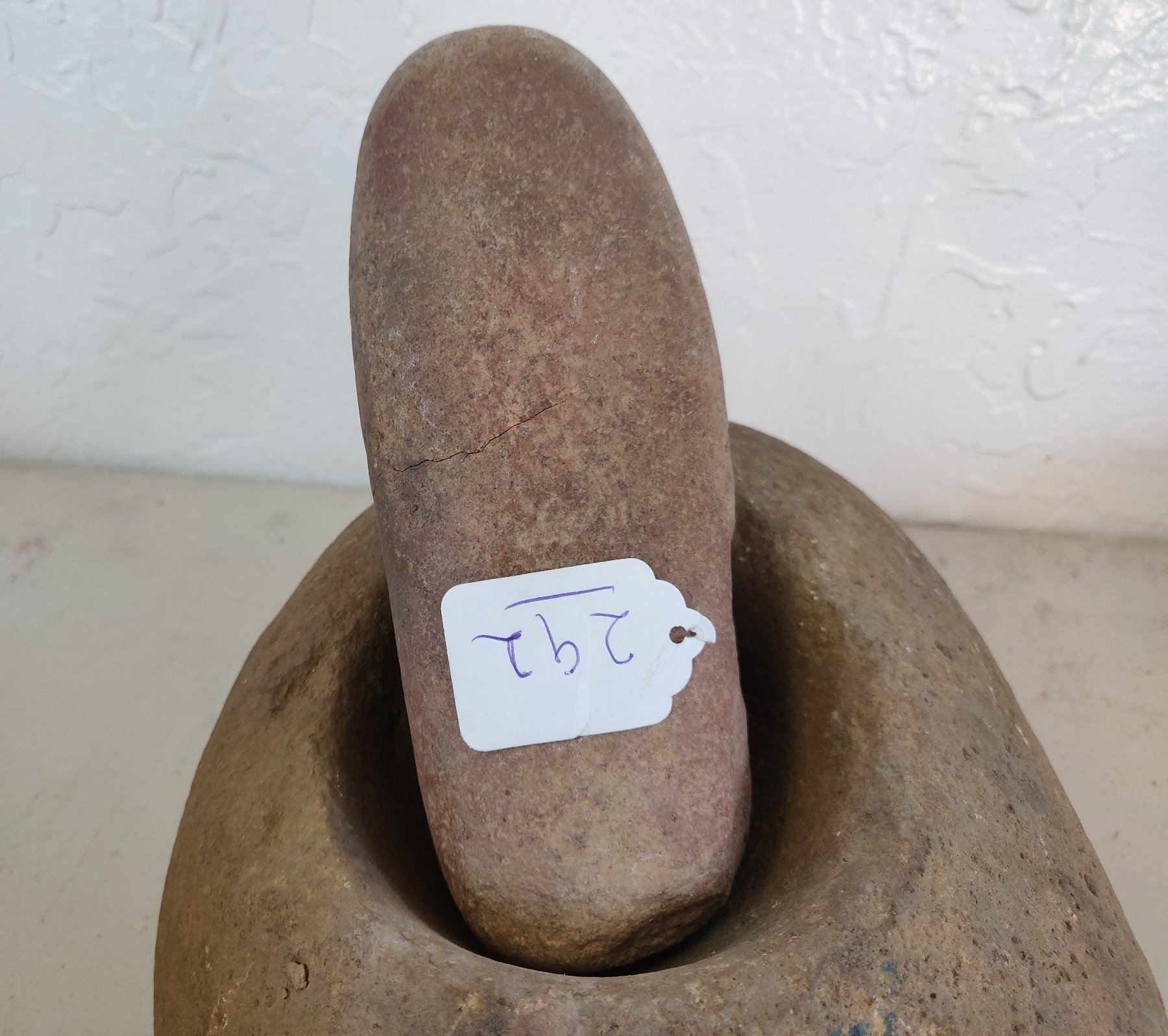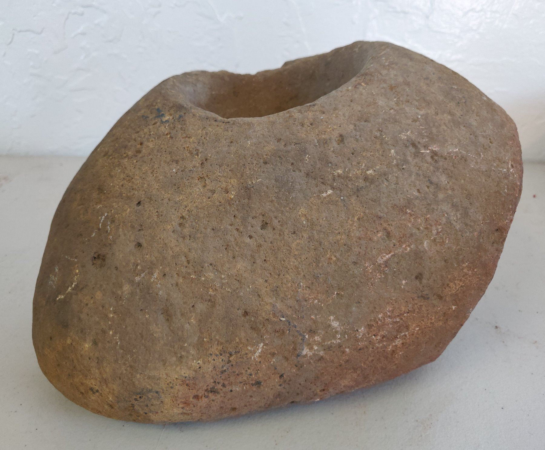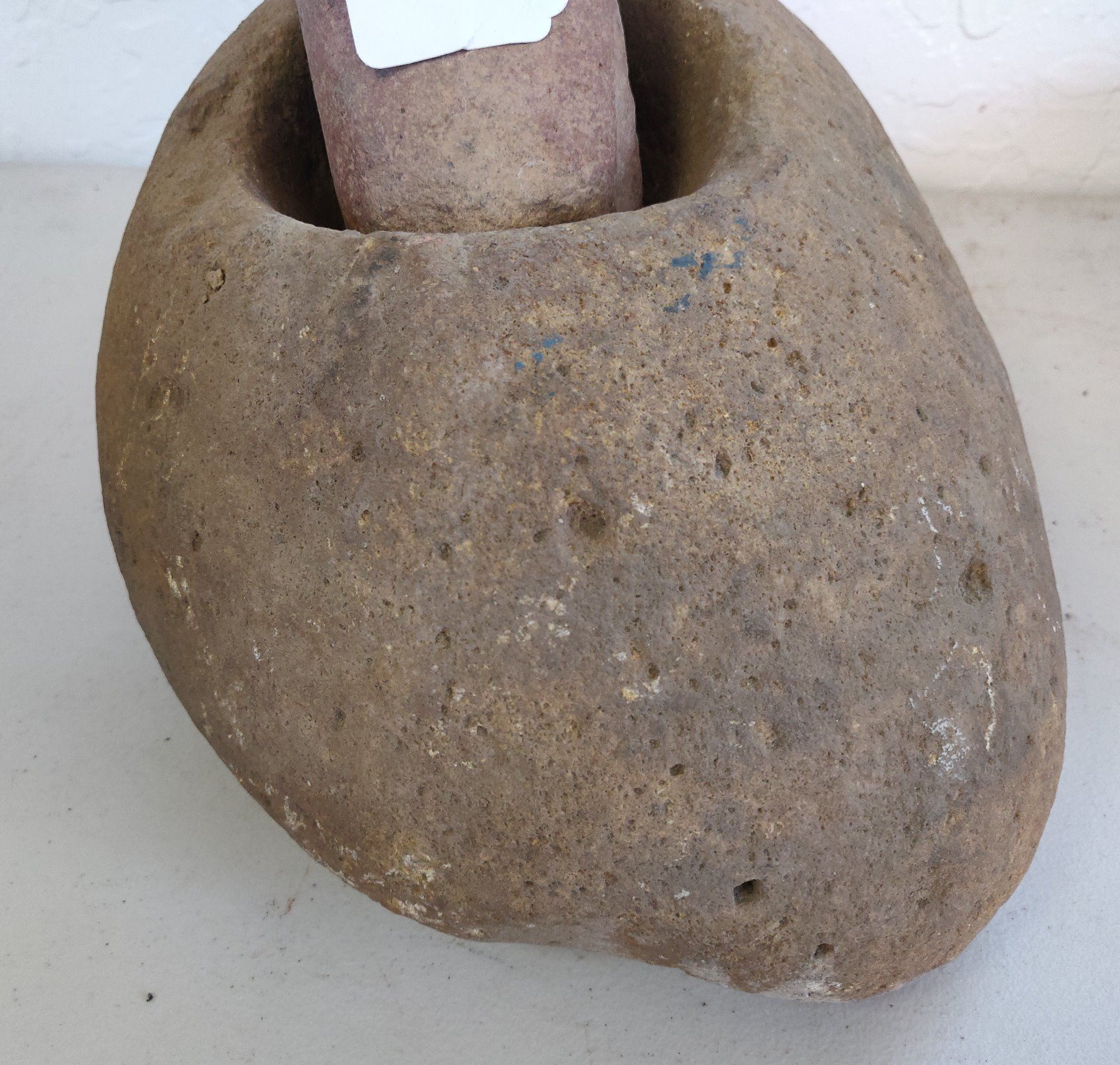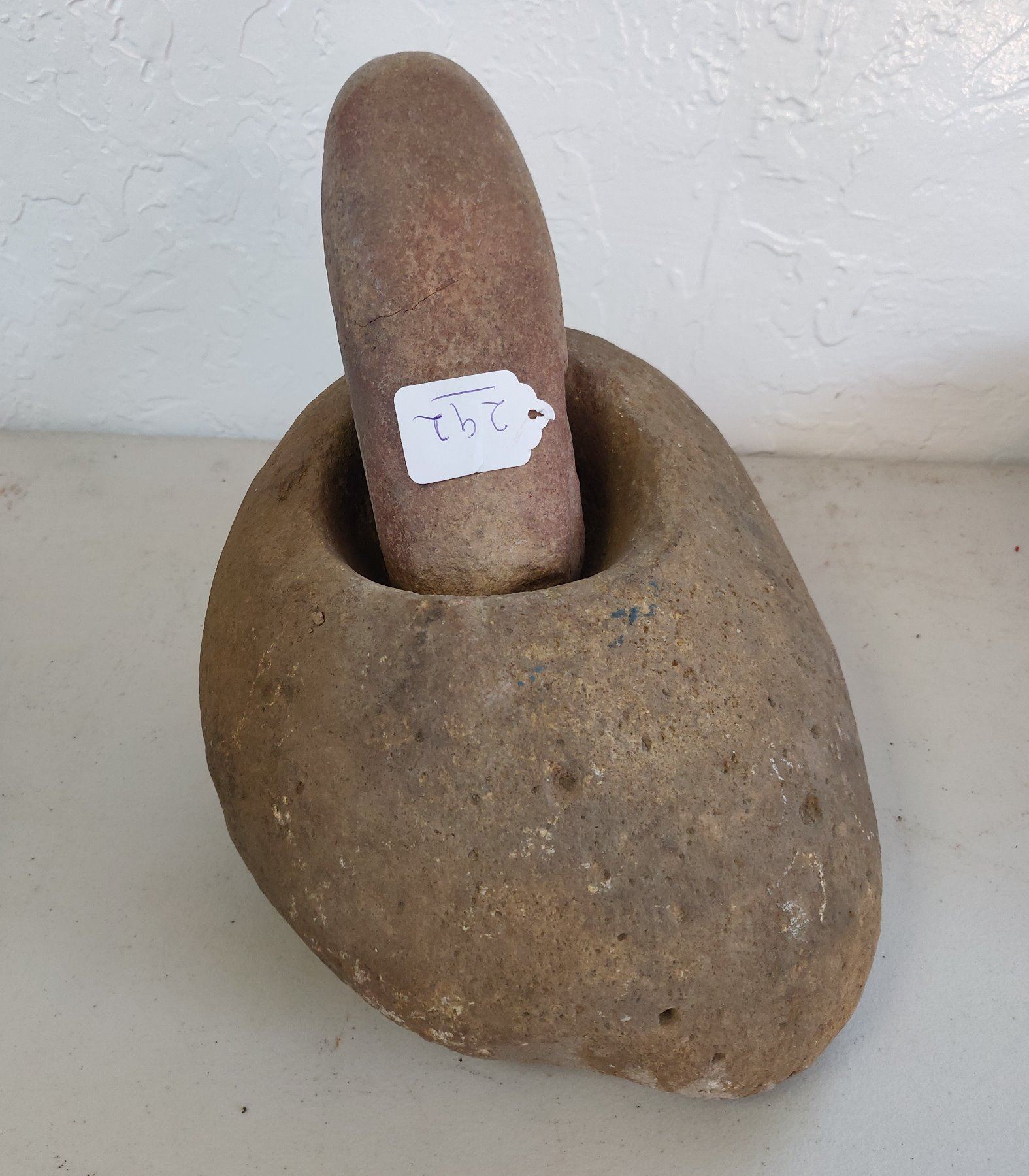 Arizona Mortar & Pestle, pre-historic item. Made of basalt stone, the item measures 10" x 8" x 9 1/2". Ajo, Pima County, Arizona. Hohokam. Condition: Chip to one end of mortar, hairline crack to pestle, see images. Shipping: $60.00 USA estimate only, due to value and heavy weight.
