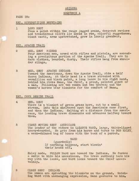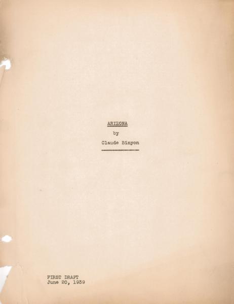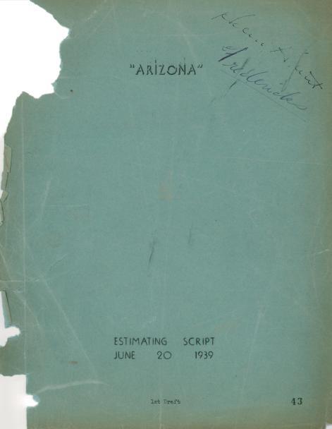 "Arizona" by Claude Binyon / Estimating Script ~ First Draft June 20, 1939 / No. 43 / Columbia / Starring Jean Arthur, William Holden, Warren William, Porter Hall, Edgar Buchanan / Front Blue Cover is separated from the clasps / The first few pages on the inside have tearing near the clasp areas / all other inside script pages are in good condition {8 1/2" x 11"}