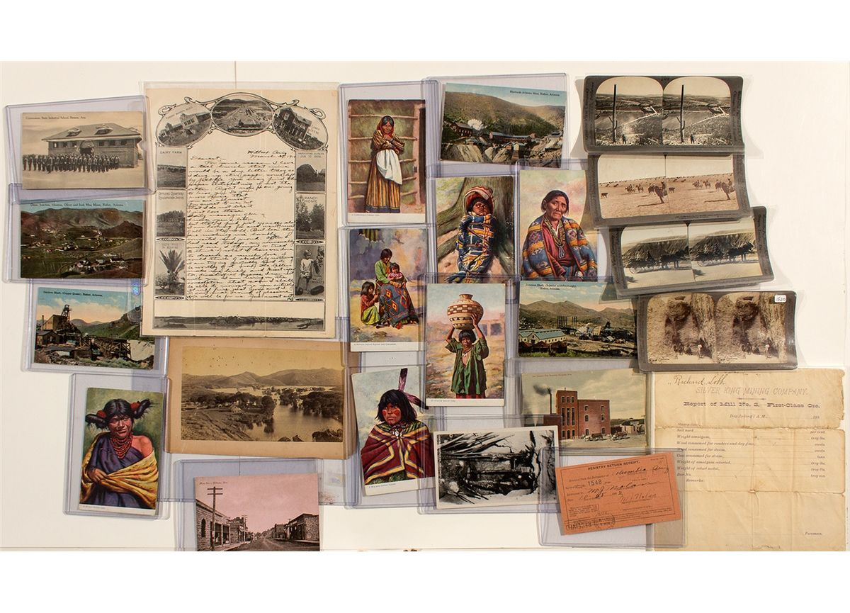 c1880 Lot of 27: this group includes post cards (15), stereo views (6), photographs (2), a mining co. Receipt, a mining incorporation articles deed , a Post Office return receipt from 1902, and a letter. The post cards are colorized, and feature the mining town of Bisbee, the towns of Douglas and Williams, and Prescott. The is an artistic group of native America painting cards in this group also. The stereo views include various Arizona scenes of mining and the desert. The photos show the town of Benson and Walnut Grove Lake near Prescott. The formation of the Stoddard Copper Co. is listed in the articles of incorporation document. This group represents a great collection of Arizona illustrations. Bud Bassett Collection - HKA#65410
