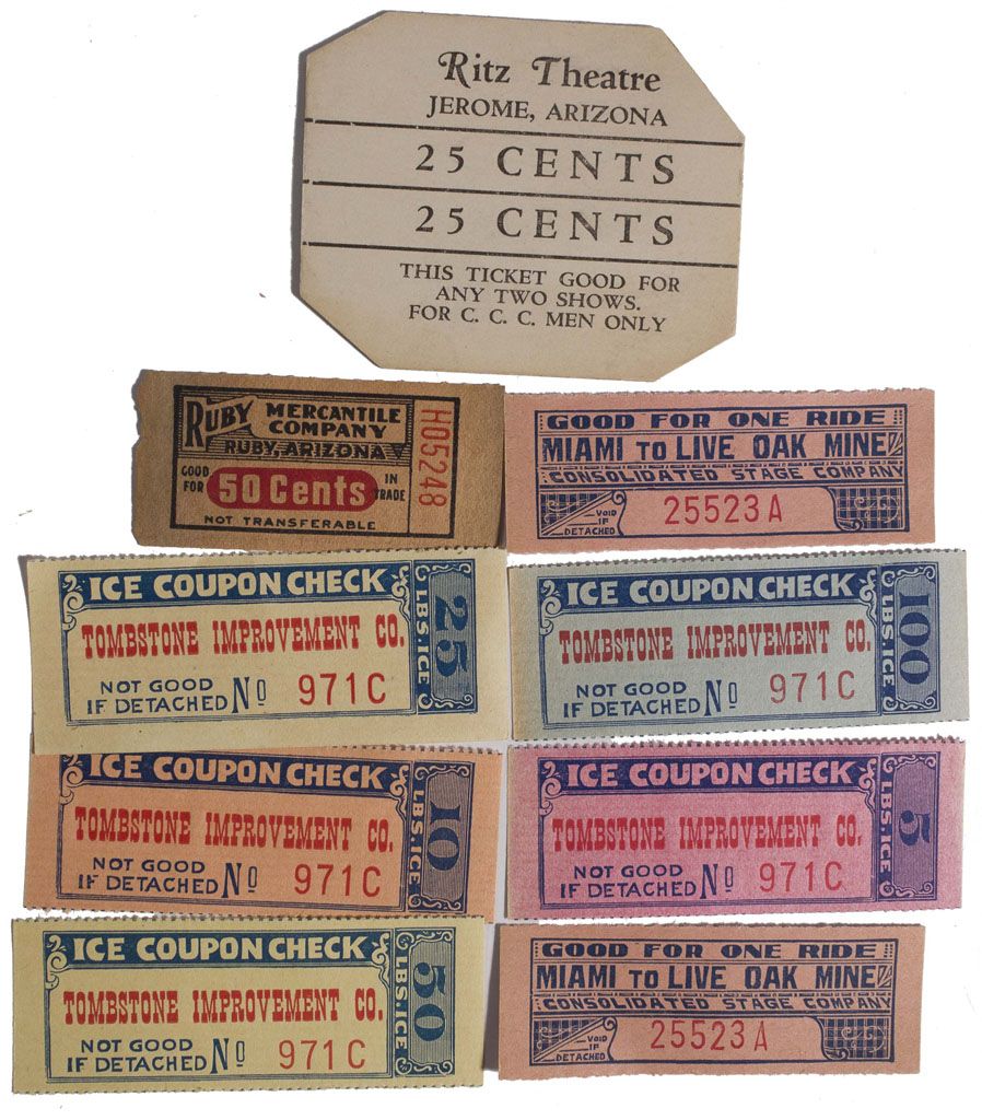 Lot of 8. 1) Ruby Mercantile Company, Ruby, AZ. GF 50 cents IT. 2" x 1". 2 & 3) Miami to Live Oak Mine GF 1 ride with the Consolidated Stage Company. 4) Ritz Theater 25 cents GF any two shows. 2.5" x 2". 5-9) Tombstone Improvement Co. Ice Coupon Checks GF 5, 10, 25, 50, 100 lbs. Of ice. Pink, orange, yellow, blue. All 2.75" x 1". All perf. Was the county seat for Cochise County, AZ until 1931. Likely named after the mine of the same name when prospector Ed Schieffelin was told he would only find his tombstone when searching in this part of Arizona [Barnes, Will C., 1988].
