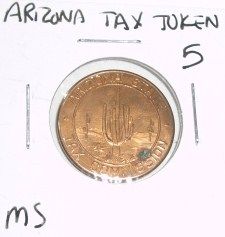 Arizona State TAX TOKEN 5 SALES TAX PAYMENT *RARE MS HIGH GRADE - NICE TOKEN*!! ***Coin, Currency & All Items Listed in this auction - Grades, Conditions and Values are not Safe Deposit Coins LLC Responsibilty. Grades, Condition and Values are determined by Consigner(s) & Buyers ONLY***