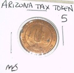 Arizona State TAX TOKEN 5 SALES TAX PAYMENT *RARE MS HIGH GRADE - NICE TOKEN*!! ***Coin, Currency & All Items Listed in this auction - Grades, Conditions and Values are not Safe Deposit Coins LLC Responsibilty. Grades, Condition and Values are determined by Consigner(s) & Buyers ONLY***