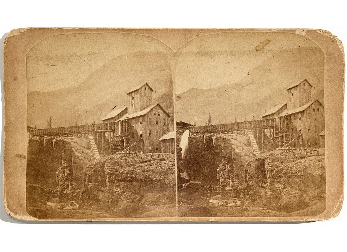c1875 Rare B & W stereo view of the Crooke Reduction Works and canyon surrounding it. The famous Crooke Mining & Smelting & Co. in the Hassayama district. The Crooke mine was about 3 miles east of the Hassayampa, and was said to have produced over $50K in gold. By 1878 they were selling stock in the mine and its works. The famous John N. Goodwin became its president, signing certificates. He layer became the Territorial Governor. Bud Bassett Collection - HKA#65414