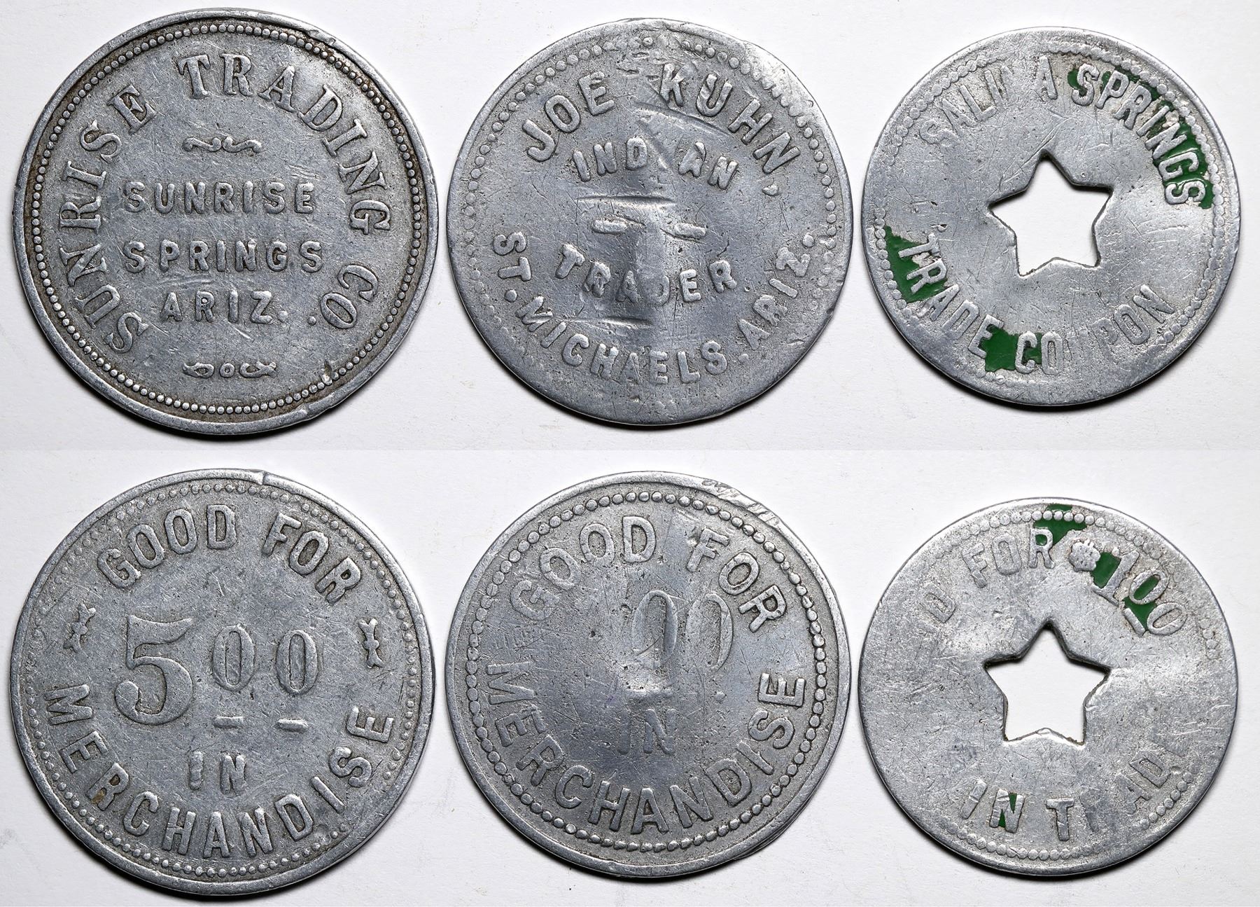 Lot of 3. 1. John Kuhn/ Indian/Trader/St. Michaels, Ariz.//G.F./1.00/In/Merchandise. Rd., A.L., 33 mm. 2. Sunrise Trading Co./Sunrise/Springs/Ariz.//G.F./5.00/in/Merchandise. Rc., A.L., 35 mm. 3. Salina Springs/Pinched 5 py star/Trading Coupon//G.F.1.00/In Trade. Rd., A.L., 31 mm.