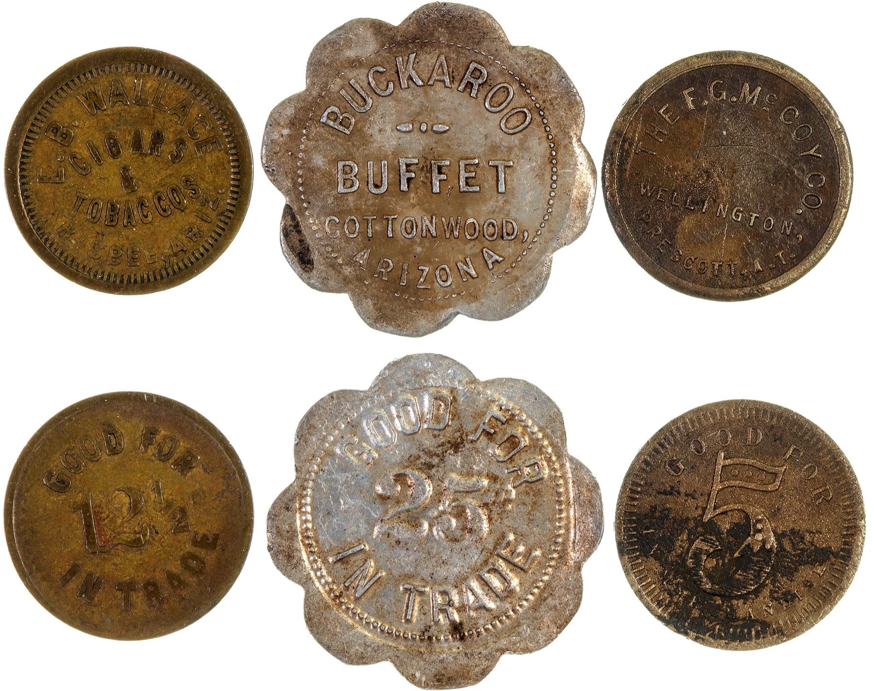 Lot of three tokens from Arizona: 1) BUCKAROO / BUFFET / COTTONWOOD, / ARIZONA // GOOD FOR / 25¢ / IN TRADE; Al., Sc8, 29 mm. 2) E.B. WALLACE / CIGARS / & / TOBACCOS / BISBEE, ARIZ. // GOOD FOR / 12½¢ / IN TRADE; Br., rd., 21 mm. 3) THE F.G. Mc COY CO. / WELLINGTON, / PRESCOTT, A.T. // GOOD FOR / 5 / IN MERCHANDISE; Br., rd., 21 mm. City: State:Arizona Date: