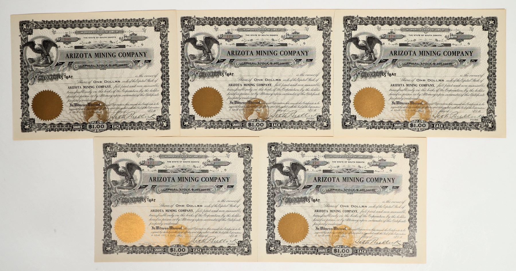 Choice uncancelled autograph from famous lawman Seth Bullock. Five stocks for the Arizota Mining Company, dateline Lead City, South Dakota, unissued. Black border and print, gold seal, eagle vignette. The mine itself was in the Harcuvar Mountains near Wenden in central western Arizona. The company had 59 claims (Mines Handbook). Seth Bullock (July 23, 1849 - September 23, 1919) was a Canadian American frontiersman, business proprietor, politician, sheriff, and U.S. Marshal. He left Montana to start a hardware business in the booming camp of Deadwood in 1876. He arrived shortly before Wild Bill Hickock was murdered. Bullock became Deadwood's first sheriff. He was later close friends with Teddy Roosevelt.