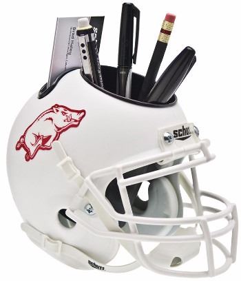 Schutt Sports NCAA Licensed Helmet Desk Caddy in the Arkansas Razorbacks logo. Perfect for the home or work office, this attention-grabbing desk ornament leaves no doubt to guests and business acquaintances who's your team. Fill it with business cards and team-colored pens, but be prepared to talk Razorbacks football when people roll in.