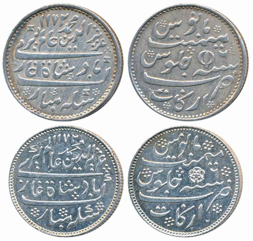 Arkat Mint, Silver Rupee (2), in the name of Alamgir II, 1172/6 RY, open and closed lotus as mint marks (KM 415.1 & 427). Extremely Fine. (2)