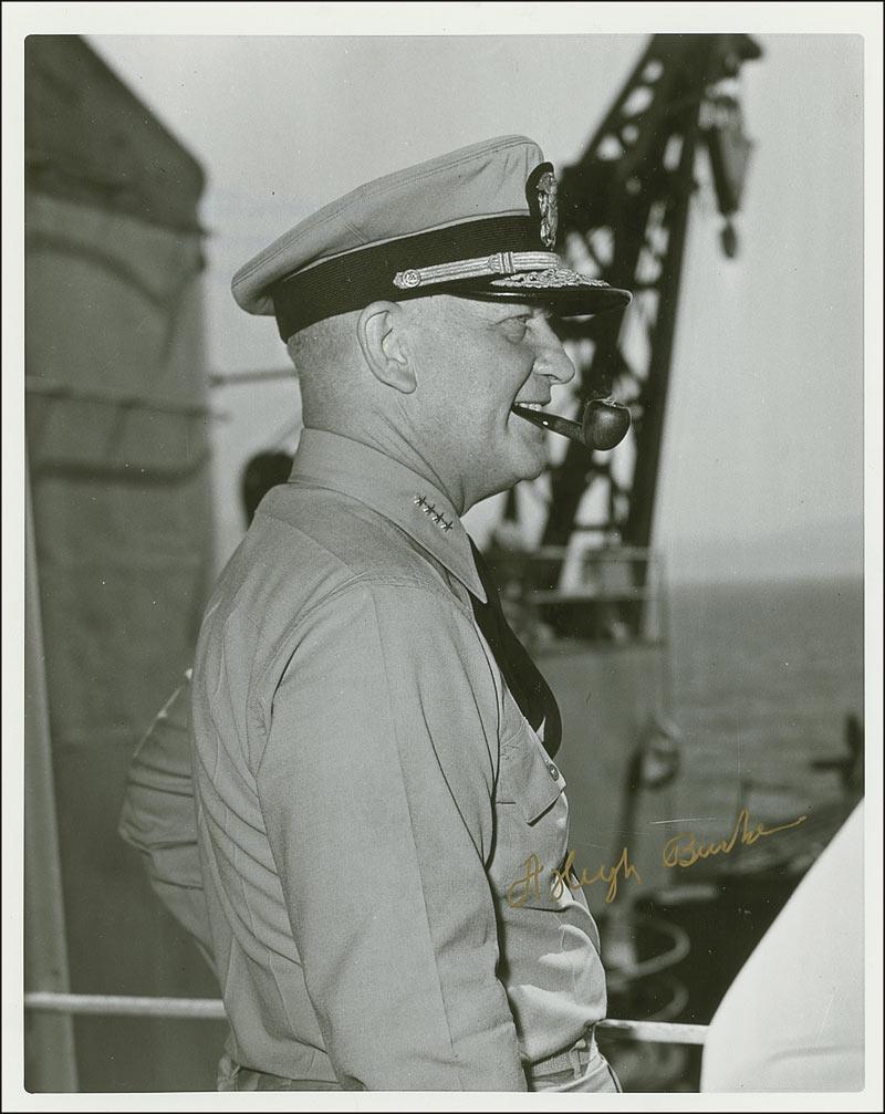 Admiral of the United States Navy (1901–1996) who distinguished himself during World War II and the Korean War, and who served as Chief of Naval Operations during the Eisenhower and Kennedy administrations. Glossy 8 x 10 photo of Burke, signed in gold ink. In fine condition, with some scattered light surface dings and streaks to emulsion.