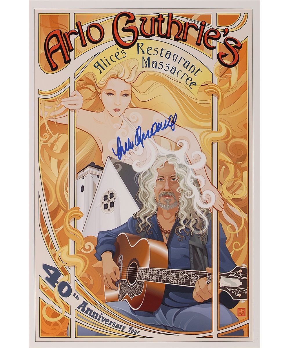 Color glossy 12 x 18 photo of a poster for the 40th Anniversary of Guthrie’s Alice’s Restaurant, signed in blue felt tip. In very fine condition.