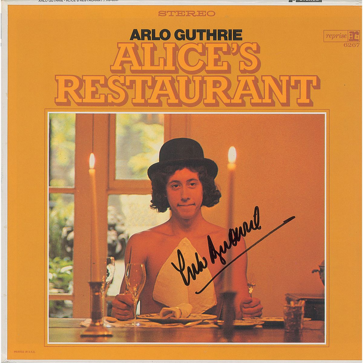 Alice’s Restaurant album signed on the front cover in black felt tip. In fine condition, with a tiny split to bottom left corner. The record is included. Consignor notes that the signature was obtained before a show at Ohio’s atmospheric Akron Civic Theatre.