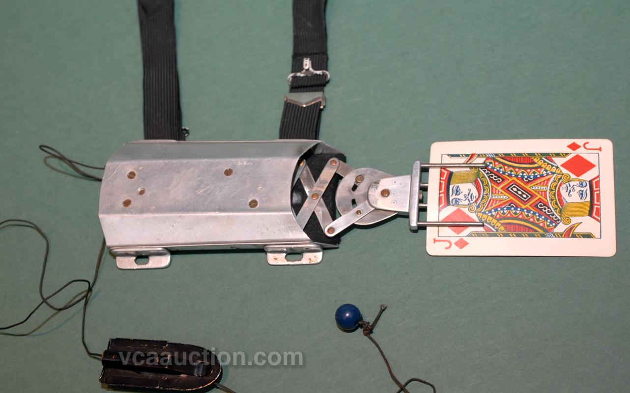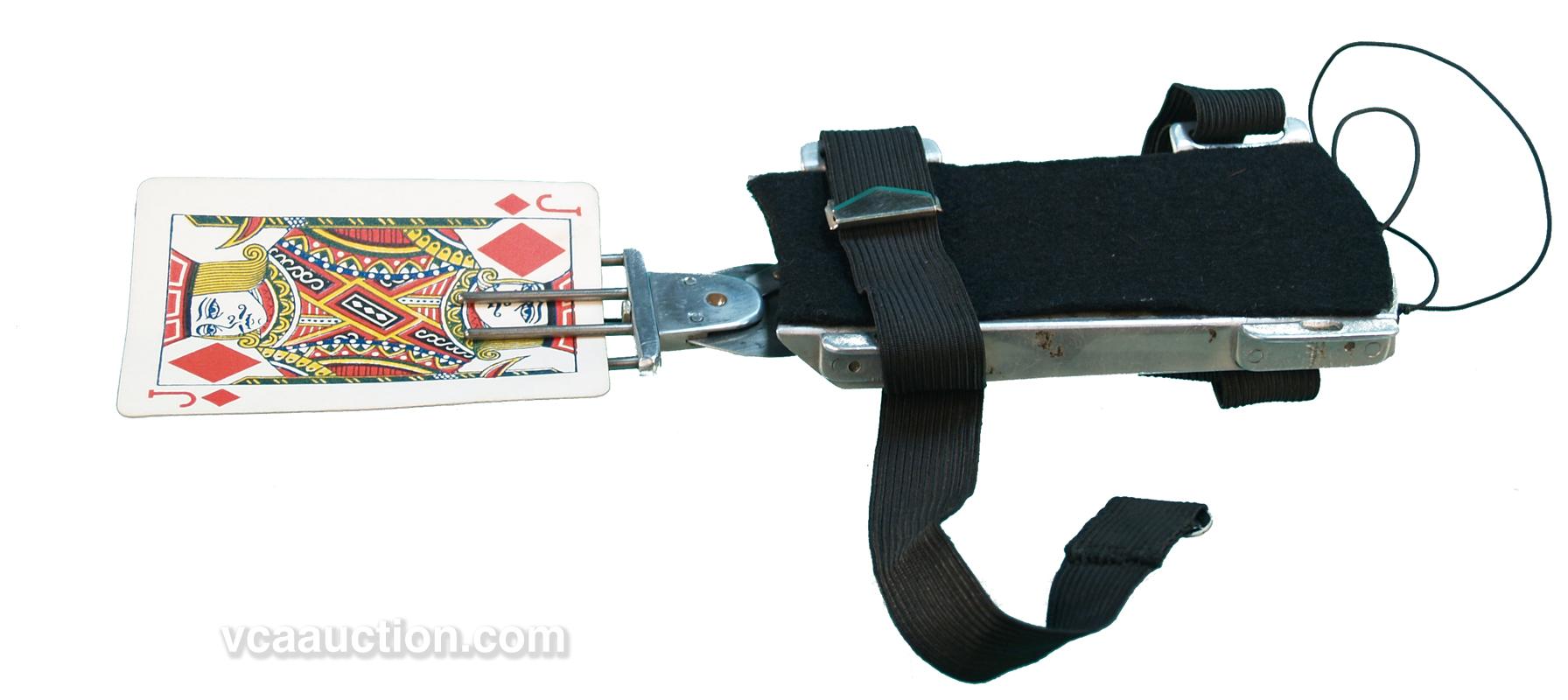 Arm Holdout Machine - Combination Jacobs Ladder within a metal encasement, tension attachment, and pulley system for extending the thief/clip. Good working condition, c1950s.