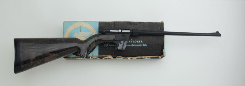 ArmaLite Model AR-7 Explorer semi-auto rifle, .22RF cal., 16” barrel, mat black finish, mottled brown plastic stock, #92260, in factory cardboard box with instructions. This gun is in overall fine condition showinglittle use with a fine bore, action, finish and stock that holds the collapsible barrel, action and magazine in the butt stock. Great for camping or on the boat. From an old estate. Est.: $200-$400.