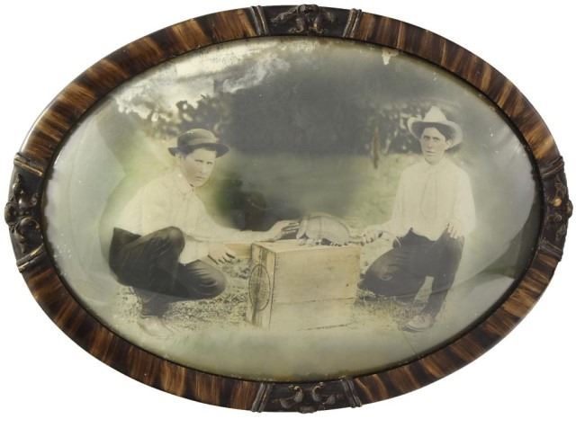 Turn of the century antique photo in dome bubble frame of two cowboys & an armadillo.