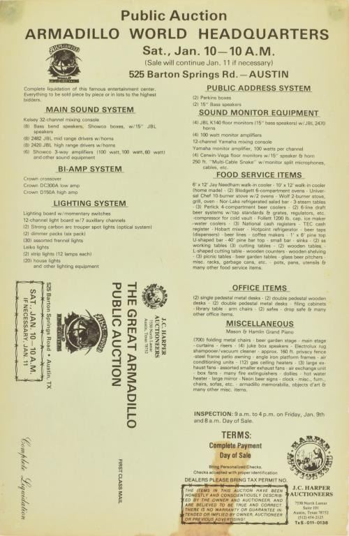 You may preview the items in person at Threadgill's, 6416 N. Lamar, Austin, Texas. Public Preview is Friday, November 6th Noon to 6PM and 8:00 AM to 10:00 AM Auction start on Saturday. (All times local).