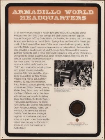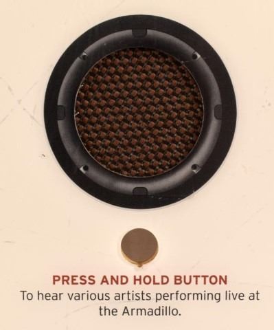 Has speaker cover and cutout for button for interactive listening of artists from the Armadillo World Headquarters & one about Kenneth Threadgill. 40.5" x 30.5"
