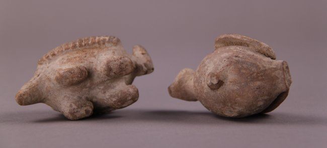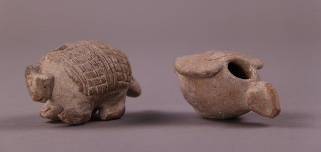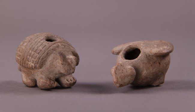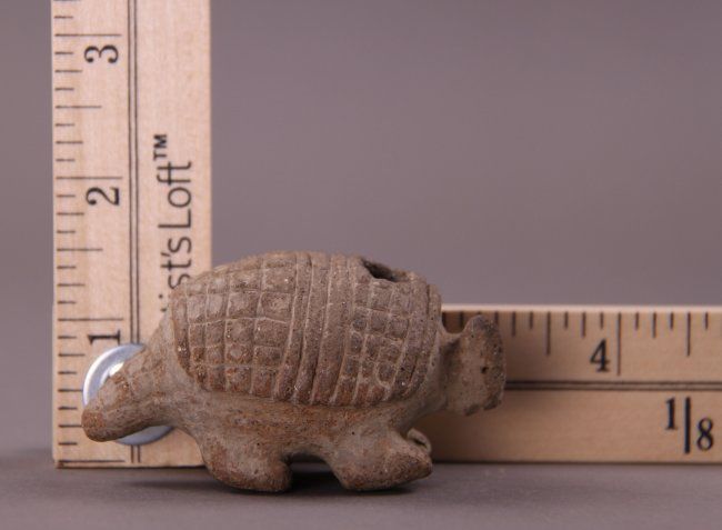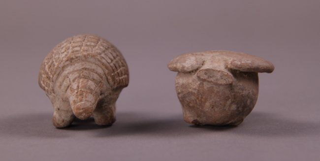 Armadillo and Dove Pre-Columbian effigy artifacts from the Malagana culture, 300 BC- 300 AD. From a private collection that was displayed by the Museo de Oro pre-Columbian exhibition. Similar works on display at the Metropolitan Museum in New York City. (Size: See last photo for measurement.)