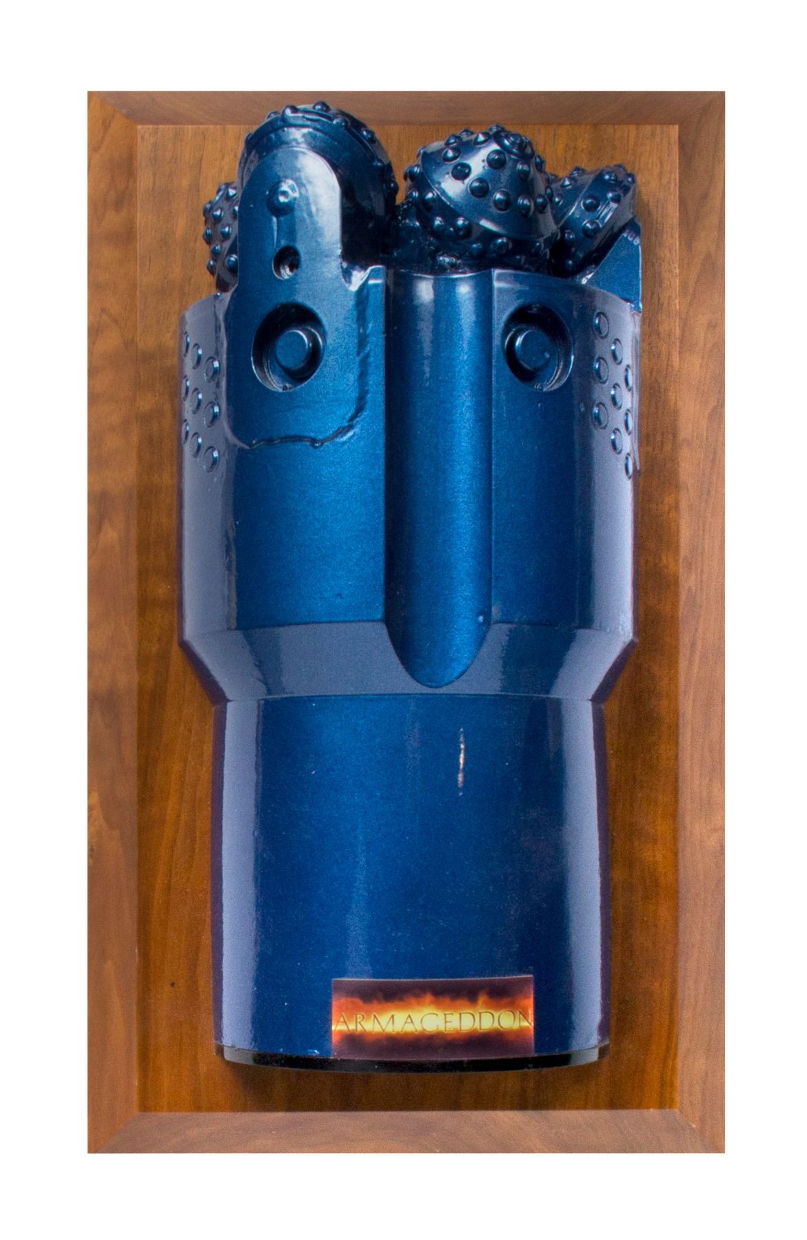 (Buena Vista, 1998) A rare crew gift from the feature film "Armageddon". This gift recreates the large drill bit used on the asteroid in the film, and is displayed on a wooden backing with the logo for the film on the bottom of the drill bit. Measuring approximately 20"x12" and 6" deep, the crew gift is in good condition overall with some wear from previous display.
