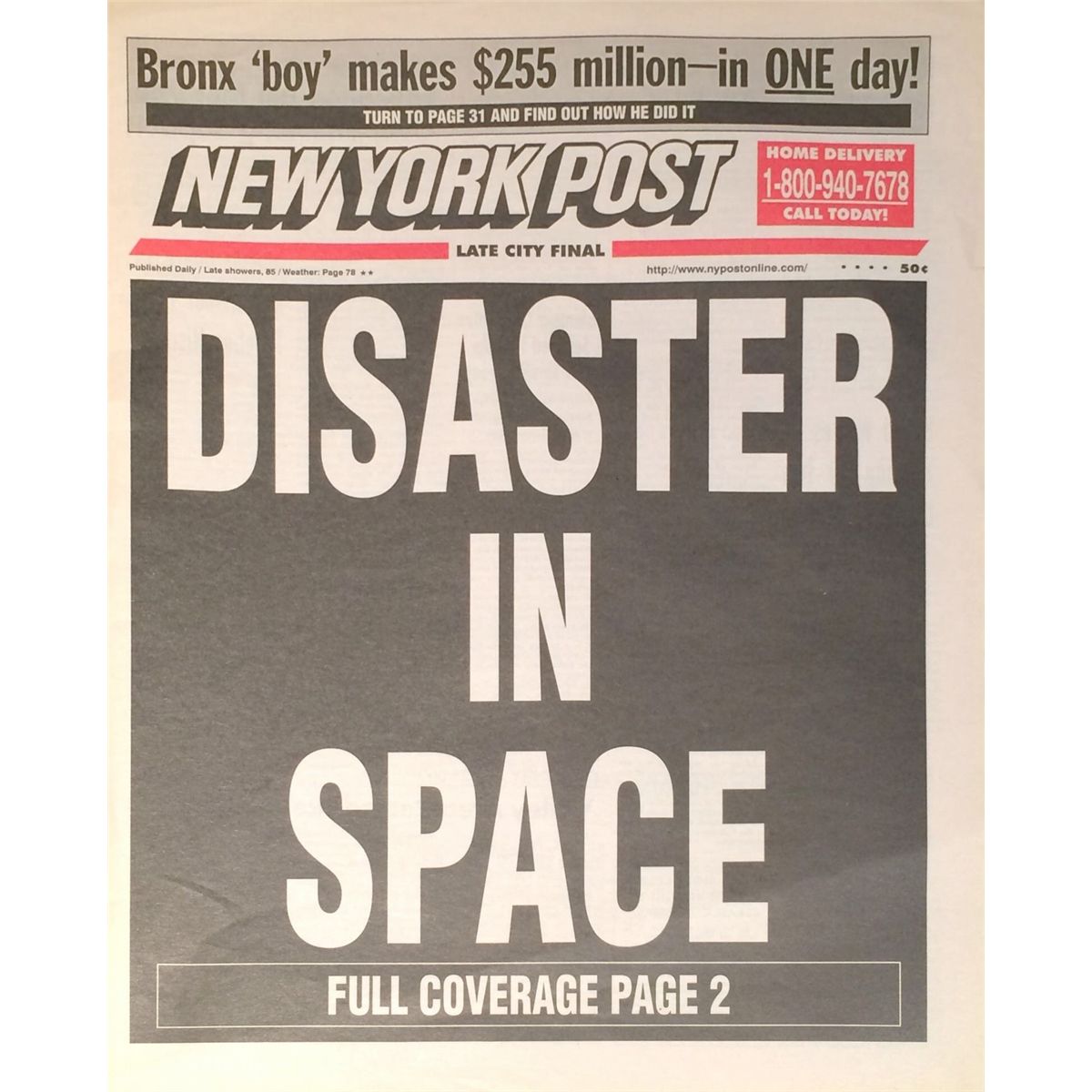 Prop New York Post newspaper used on screen, headline declaring “Disaster in Space!”