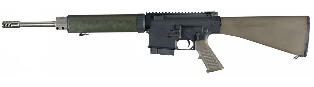 Heavy stainless barrel with muzzle brake, stainless picatinny rail, gas block, smooth green fiberglass tubular forearm with sling swivel, flattop upper with brass deflector, checkered synthetic polymer pistol grip and smooth synthetic polymer stock with rear sling attachment and checkered plastic buttplate with trapdoor. With extra magazine, sling and operator manual.