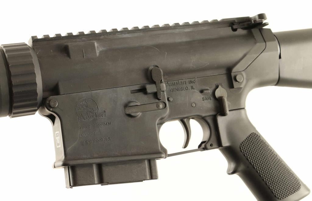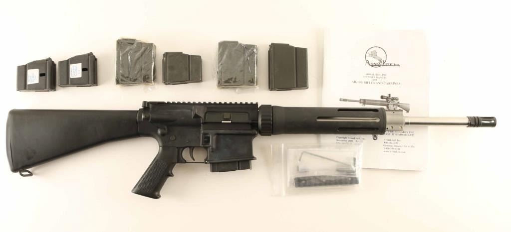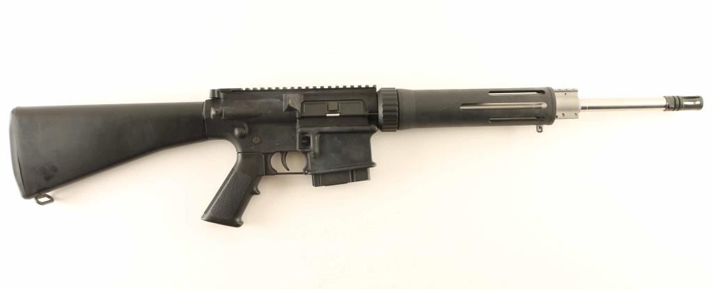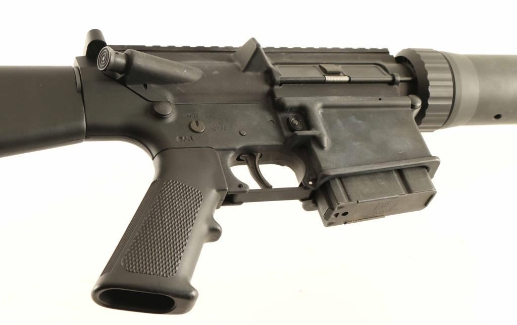 'Target Carbine' Semi-automatic modern sporting rifle chambered in 7.62x51mm NATO. Features a matte black finish, 16.5" stainless steel barrel, A2 birdcage flash hider, single rail gas block, flat top upper receiver with shell deflector, forward assist & dust cover, two-stage trigger, thumb safety on the left side of the receiver, push button magazine release, 10 round factory steel magazine, slotted free float alluminum handguard that is drill & tapped at the 12 o'clock position for accessories, A2 pistol grip and black polymer A2 shoulder stock. Includes a manual, six extra factory magazines and a 5" rail segment for the handguard. Rifle retains approximately 97% original finish showing a bright spot of wear on the optic rail and scattered scuffs. Action is crisp, the bore is excellent and the synthetic stocks are fine. Condition is near NRA Excellent. ***Modern Firearm***