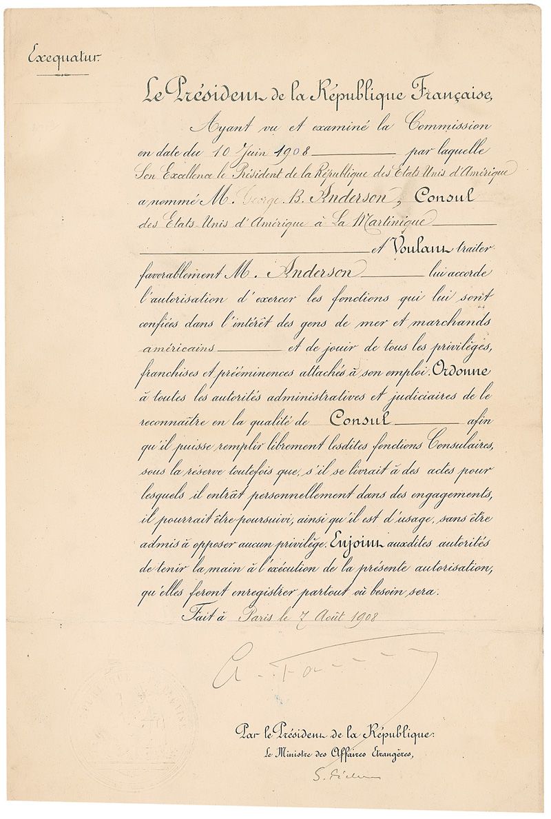 French politician (1841–1931) who served as president of the French republic from 1906 to 1913. Partly-printed DS, in French, signed “A. Fallieres,” one page, 10.75 x 16, August 7, 1908. Untranslated official appointment, countersigned by the Minister of Foreign Affairs, with large embossed ‘Republique Francaise’ stamp in the lower left. In very good condition, with intersecting storage folds and creases, a few scattered tack holes, some light soiling, and a paper backing affixed to reverse of the upper half. A scarce document; the only one we have seen come to market.