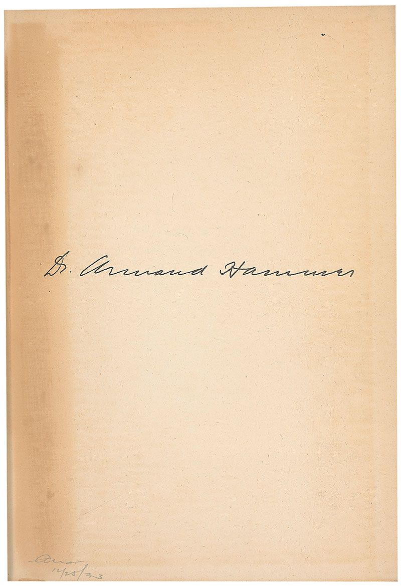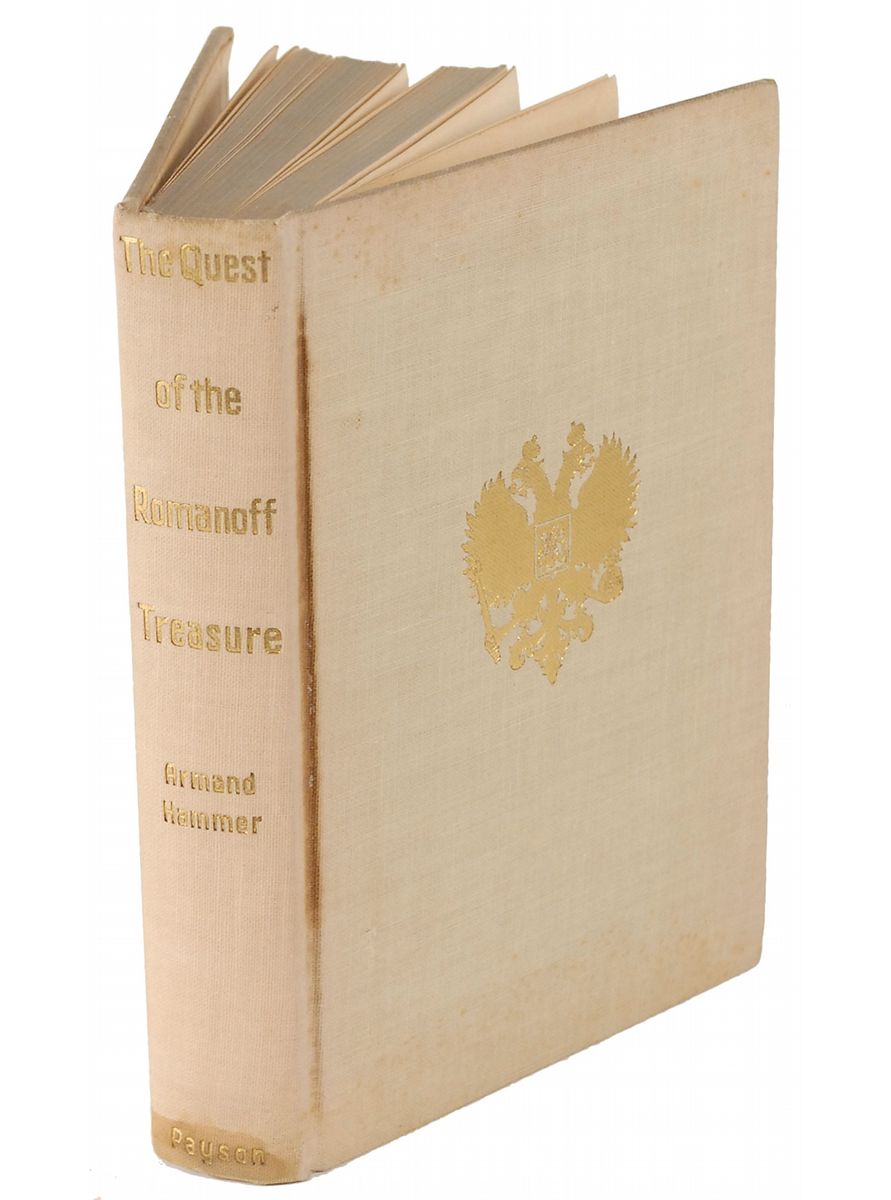 Signed book: The Quest of the Romanoff Treasure. First edition. NY: William Farquhar Payson, 1932. Hardcover, 5.75 x 8.25, 241 pages. Signed on the first free end page in fountain pen, “Dr. Armand Hammer.” In very good condition, with bands of toning to signed page and inside covers (slightly affecting signature) and some staining to exterior.