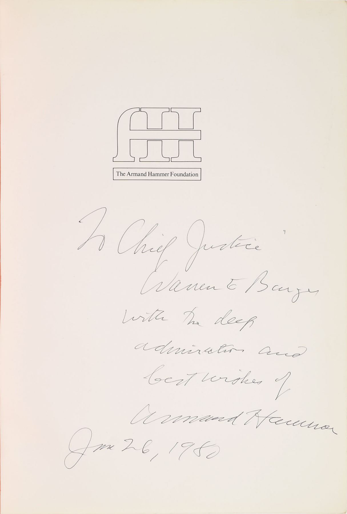 American business manager and owner (1898–1990) who ran the Occidental Petroleum Corporation from 1957 until his death; he is also remembered for his art collection, his philanthropy, and for his close ties to the Soviet Union. Signed book from the personal library of Warren Burger: an exhibition catalog for The Armand Hammer Collection held at the Museum of Fine Arts in Houston, Texas, between October 26, 1979 and January 20, 1980. Los Angeles, CA: The Armand Hammer Foundation, 1979. Softcover, 8.5 x 11. Signed and inscribed on an opening page in black ballpoint, "To Chief Justice Warren E. Burger, with the deep admiration and best wishes of Armand Hammer, June 26, 1980." Inside of front cover bears an affixed bookplate belonging to Chief Justice Burger. In fine condition, with light cover wear.