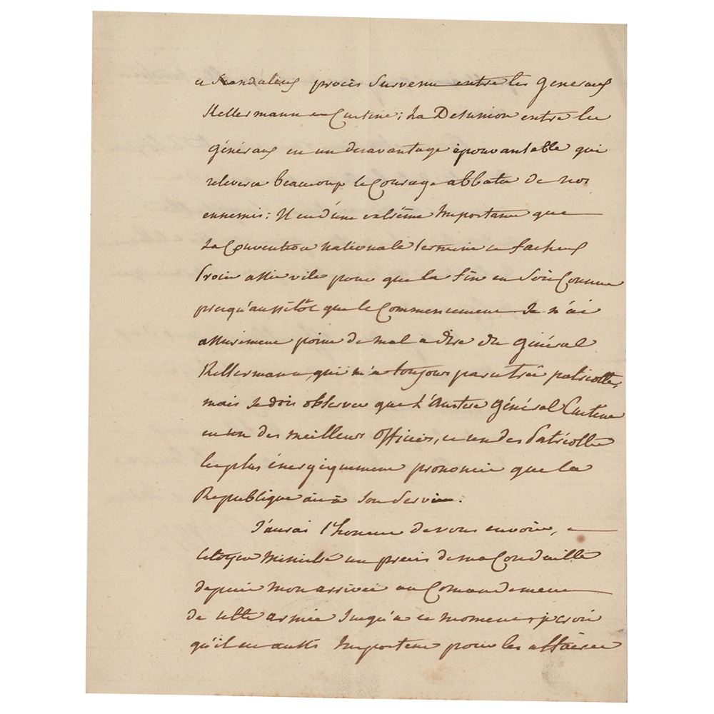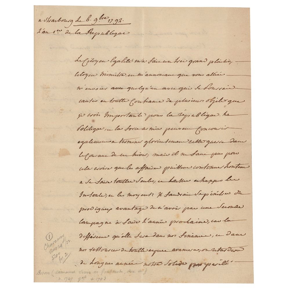 French soldier and politician, duc de Lauzun, later duc de Biron, (1747–1793) remembered for his roles in the American War of Independence and the French Revolutionary Wars. Commanding Lauzun's Legion, he successfully reinforced Washington's troops during the Siege of Yorktown in 1781. He then commanded the French Revolutionary Army on the La Rochelle front during the French Revolution, operating against the Vendéan insurgency. Accused of treason, he was guillotined during the Reign of Terror. ALS in French, signed “Biron,†four pages on two adjoining sheets, 6.25 x 7.25, November 6, 1792. Handwritten letter thanking a minister for the advice given him by Citoyen Egalite regarding the visit of a person with whom he could talk in all confidence about several important matters for the Republic. Politics and military might work together to bring the war to a glorious end next winter, but business cannot end on its own. He enumerates the means which seem to him suitable for putting an end to the war and avoiding a future campaign, such as, for example, dealing with the kings this time around: "We will ripen universal freedom by hating peace and this consideration well deserves some sacrifices of pride from truly republican hearts." Biron deplores the scandalous lawsuit between Kellermann and Custine; he will raise up the downcast courage of the enemies. In fine condition, with a few small stains.