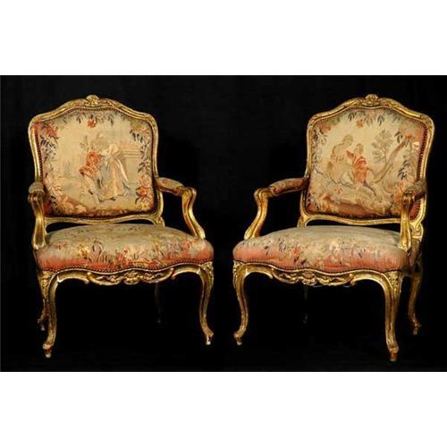 19th Century pair of Louis XV armchairs. Gilded wood, with Aubusson tapestry upholstery. Excellent condition, circa 1850. Sold as Pair only.