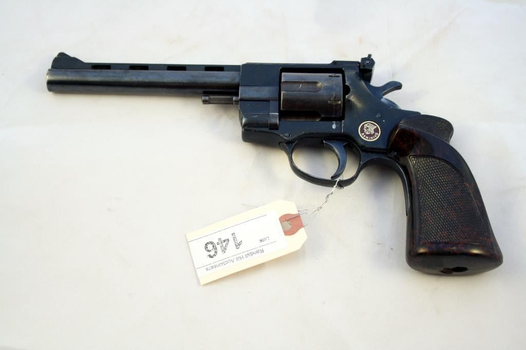 Armenius Six Shot Double Action Revolver, Caliber 38 Special Model HW38 Made in Germany. Six inch vent rib barrel, molded plastic grips #548962 About 90% blue. Target sights.