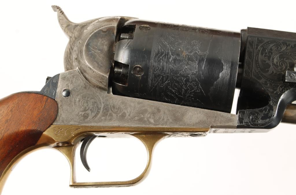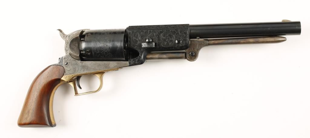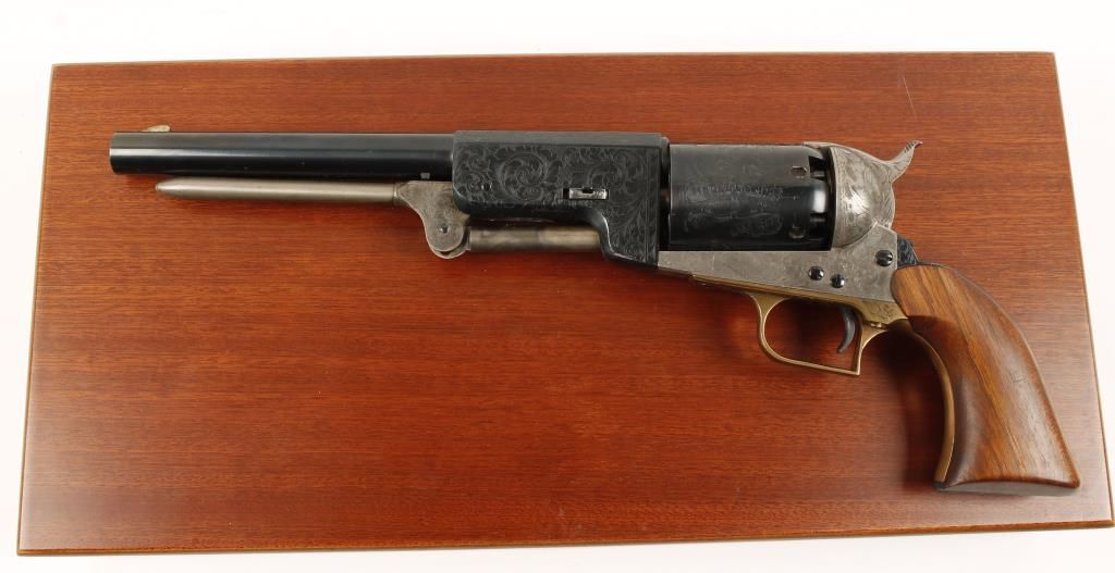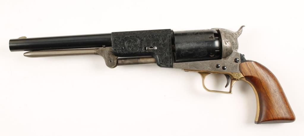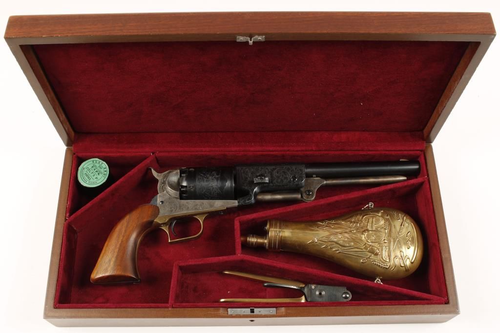 Cased and engraved replica black powder single action 6-shot percussion pistol. Blued 9" barrel. Case colored loading lever and hammer. Blued and roll-stamped cylinder showing an indian battle. Brass square backed trigger guard. Blued backstrap. Not cut for a shoulder stock. Lined hardwood case with loading tools. boxes. Condition is very good to excellent. *Antique Firearm*
