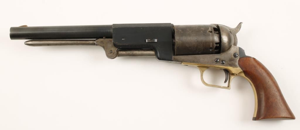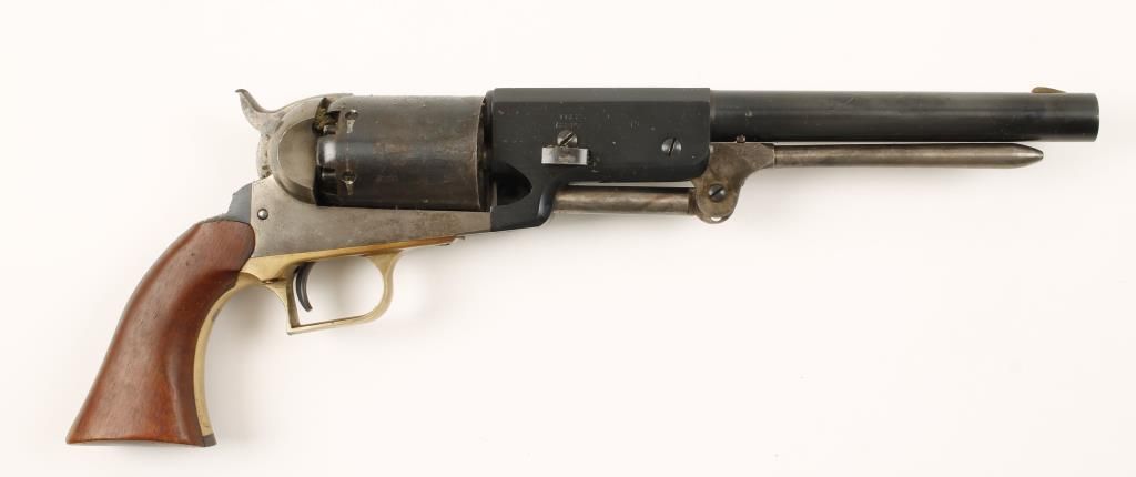 Replica black powder single action 6-shot percussion pistol. Blued 9" barrel. Case colored loading lever, hammer, frame and trigger. Blued and roll-stamped cylinder showing an indian battle. Brass square backed trigger guard. Blued backstrap not cut for a shoulder stock. Comes in factory box. Condition is good. *Antique Firearm*
