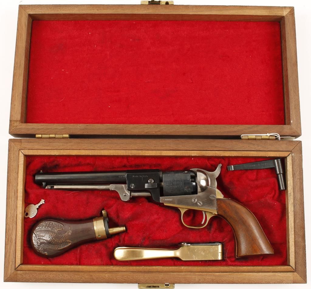 Cased replica black powder single action 5-shot percussion pistol. Blued 6" barrel. Faded case colored loading lever, frame, hammer and trigger. Blued and roll-stamped cylinder showing a Stagecoach hold-up. Brass trigger guard and backstrap. Not cut for a shoulder stock. Lined hardwood case with loading and maintenance tools and a key. Condition is good. *Antique Firearm*