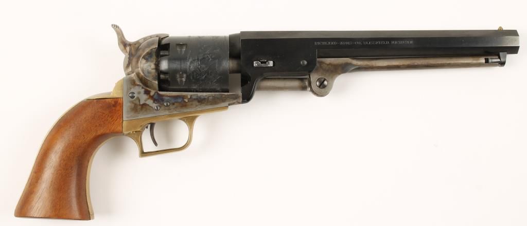 Replica black powder single action 6-shot pistol. 7-1/2" blued octagon barrel. case colored loading lever, frame, hammer and trigger. Blued and engraved cylinder showing a naval engagement. Brass square backed trigger guard and backstrap. Not cut for a shoulder stock. Condition is very good. *Antique Firearm*