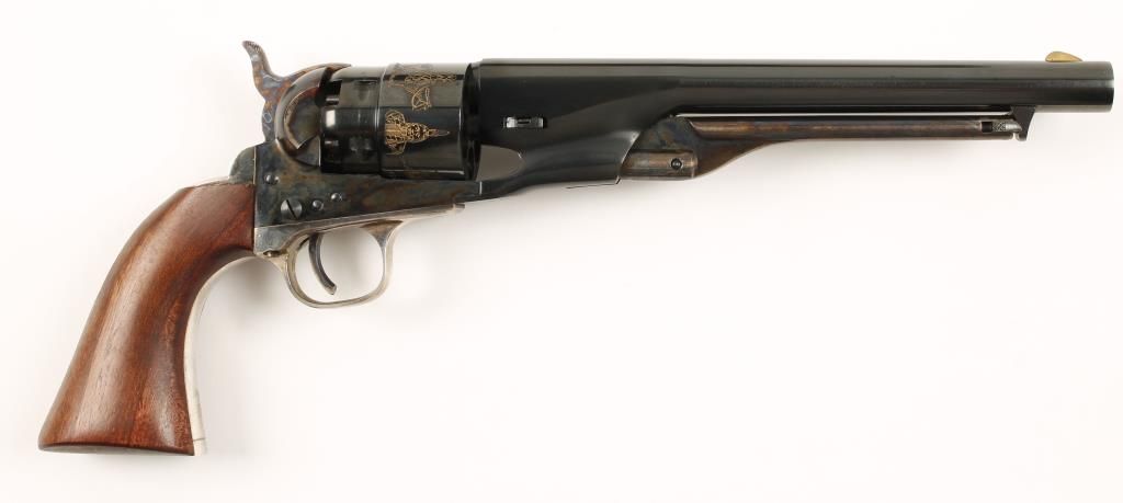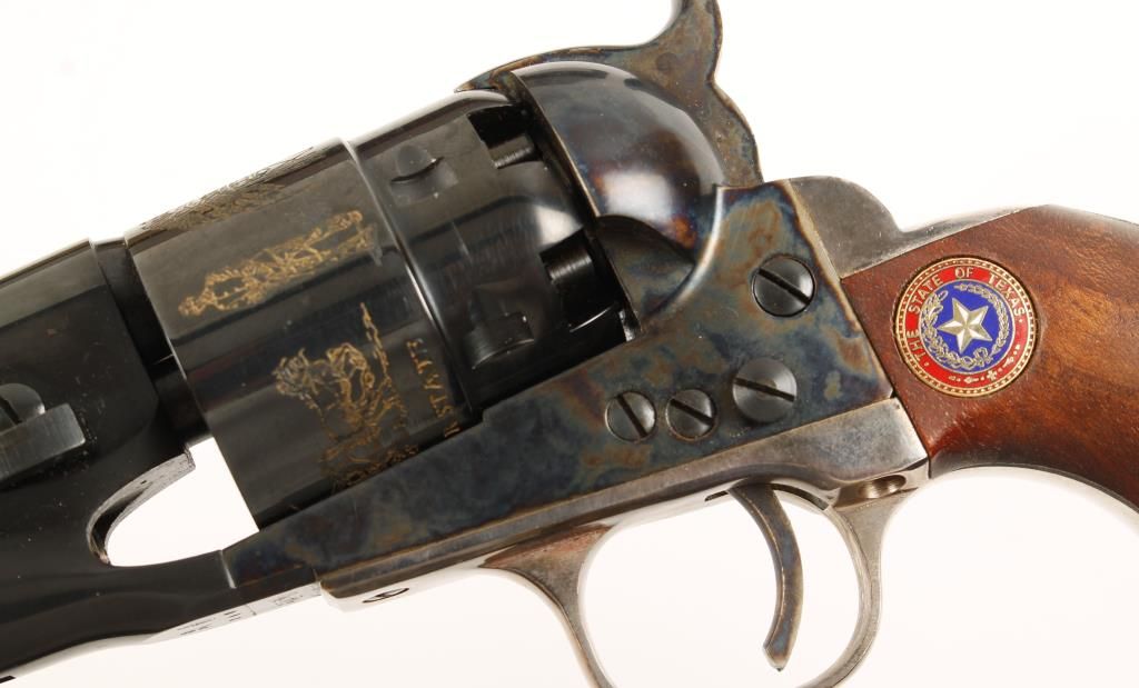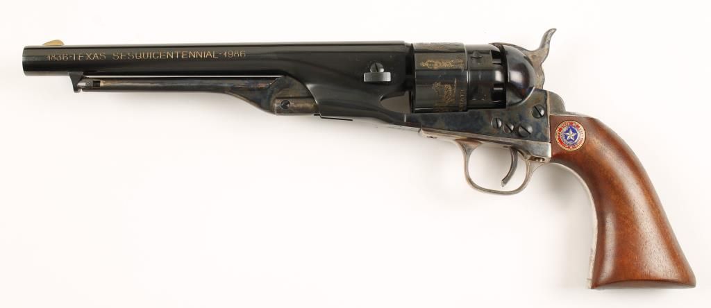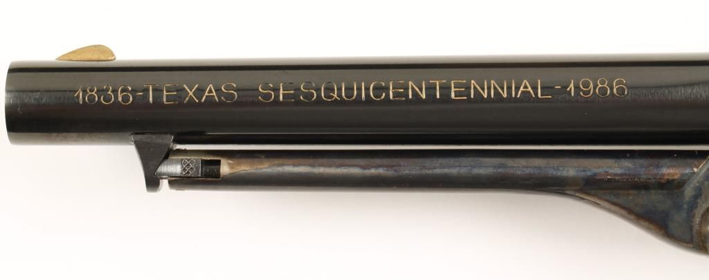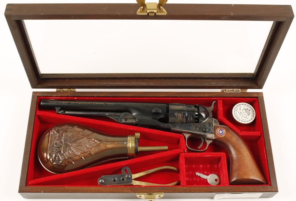 Cased Texas Sesquicentennial commemorative replica black powder single action 6-shot percussion pistol. Blue 8" barrel. Case colored loading lever, frame, hammer and trigger. Blued and roll-stamped cylinder showing a cowboy, indian stagecoach, soldier and indian chief. plated non-ferrous trigger guard. Plated steel backstrap. Cut for a shoulder stock. Left grip has the seal of Texas inlaid in it. Lined hardwood case with glass top, loading tools, documents and a key. Condition is excellent. *Antique Firearm*