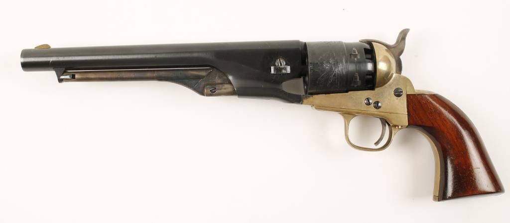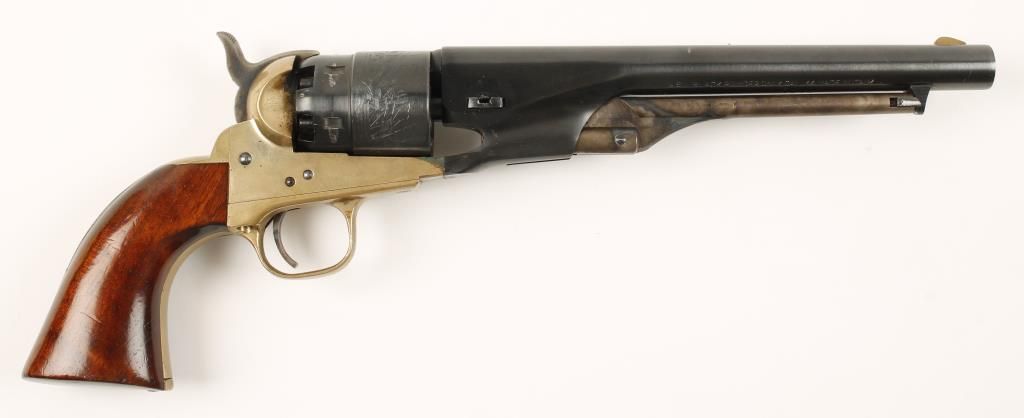 Replica black powder single action 6-shot pistol. 8" blued barrel. Case colored loading lever, hammer and trigger. Blued and roll-stamped cylinder showing a naval engagement. Brass frame, trigger guard and backstrap. Not cut for a shoulder stock. Condition is good plus. *Antique Firearm*