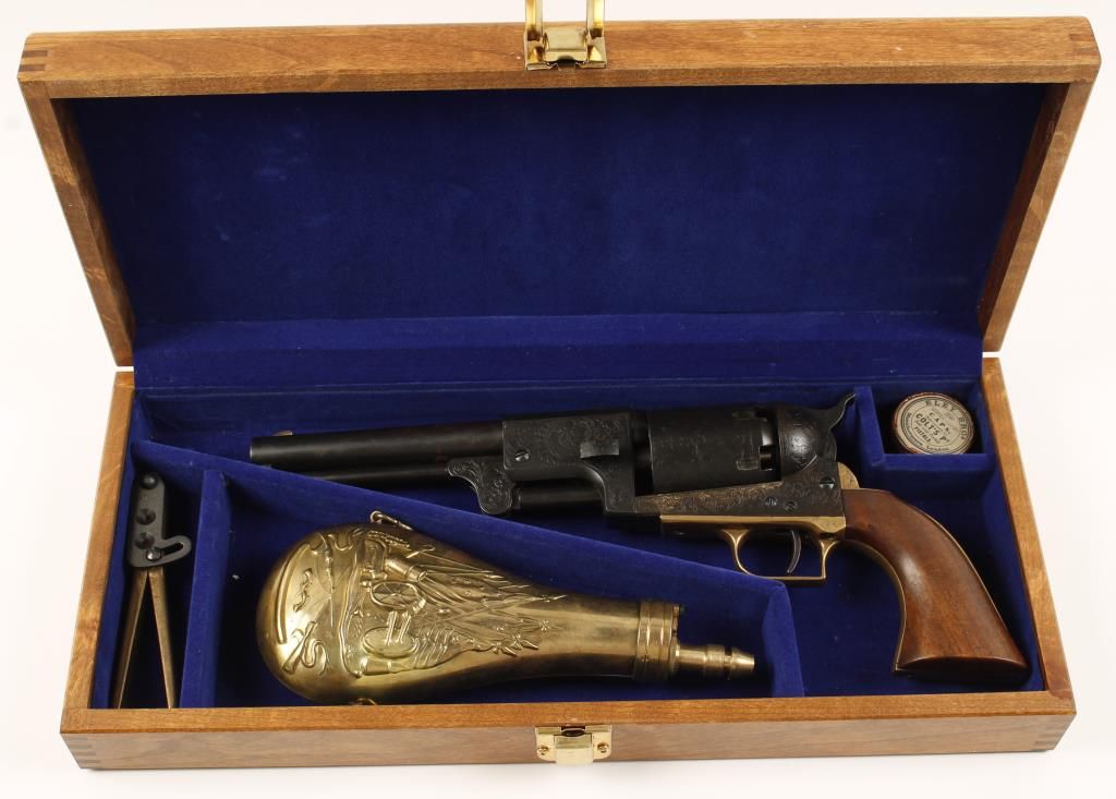 Cased and engraved replica black powder single action 6-shot percussion pistol. Blued 7-1/2" barrel. Blued loading lever, frame, hammer and trigger. Blued and roll-stamped cylinder. Brass trigger guard and backstrap. Not cut for a shoulder stock. Lined hardwood case with loading tools. Condition is excellent. *Antique Firearm*