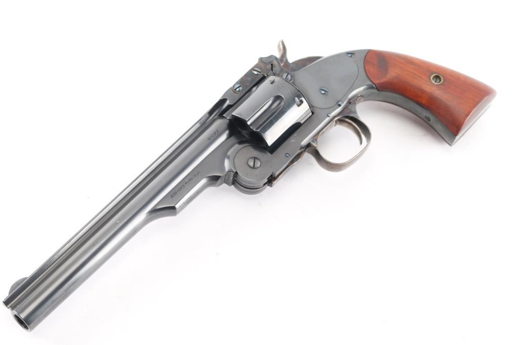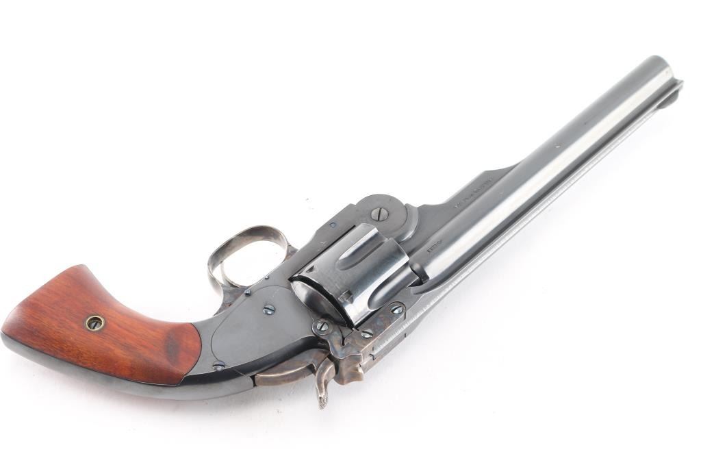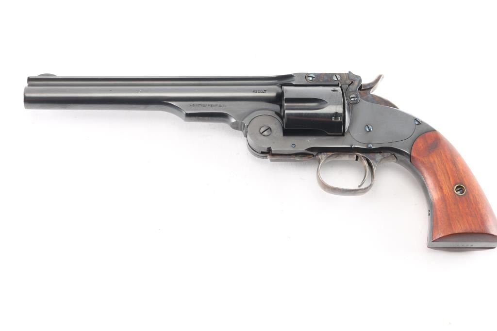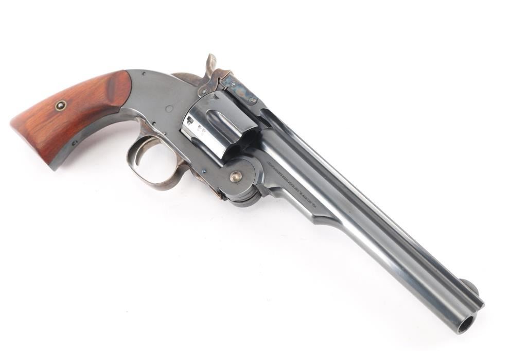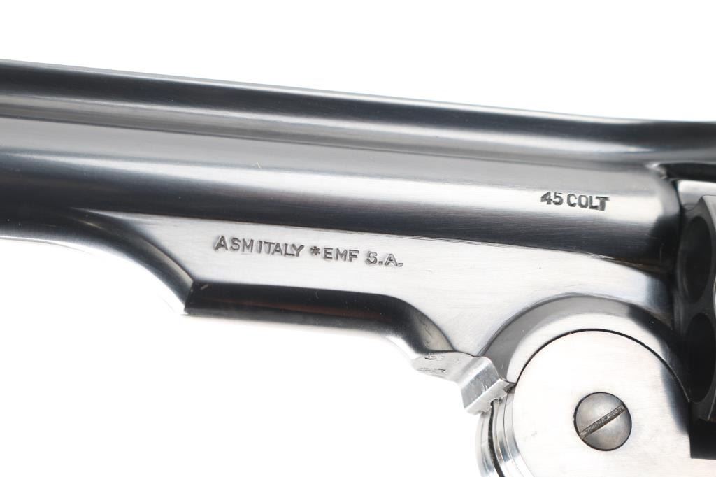 Calvary Model Italian reproduction single action revolver chambered in .45 Colt, Made by ASM and imported by EMF circa 1991. Features a blued & case hardened hammer, trigger and triggerguard, ribbed 7" barrel, blade front sight, notched rear sight, smooth trigger, checkered hammer spur, and smooth two-piece wood grips. Revolver exhibits approximately 98% of its original blued finish, showing a faint drag line and a few very minor scratches. Action is smooth, lock-up is tight, star extractor works well, bore is excellent and wood grips are fine. Case colors are excellent.NRA Condition-Excellent. Modern Firearm.