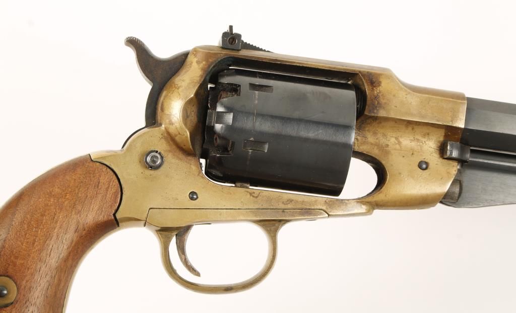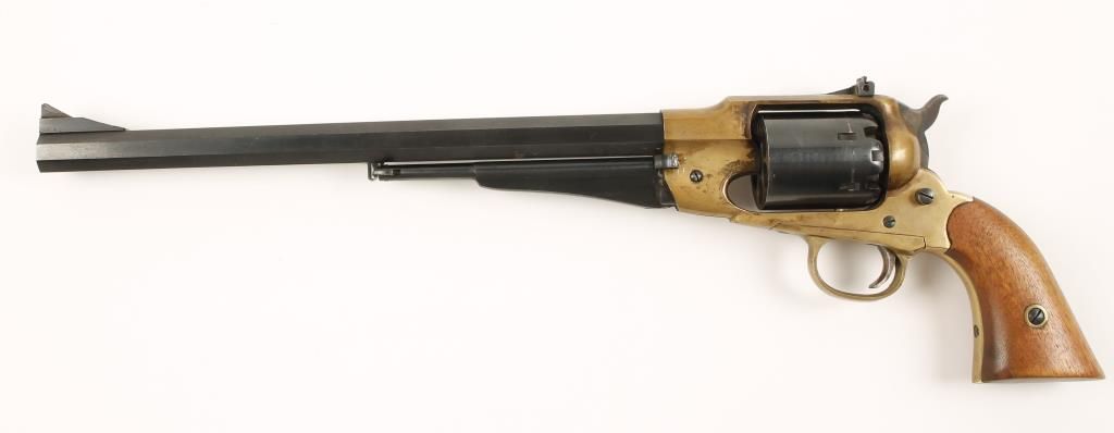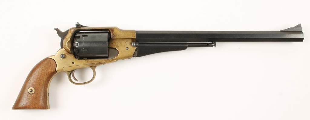 Replica black powder single action 6-shot pistol. 12" blued octagon barrel. Adjustable rear sight and ramp front sight. Blued loading lever and cylinder. Brass frame and trigger guard. Not cut for a shoulder stock. Condition is good with tarnished brass. *Antique Firearm*