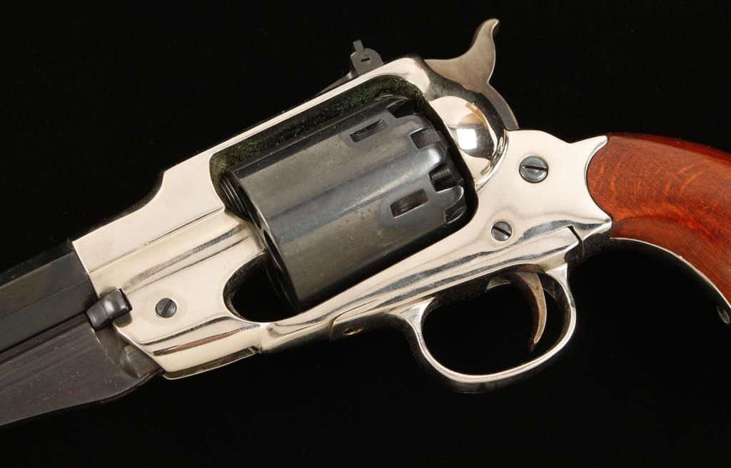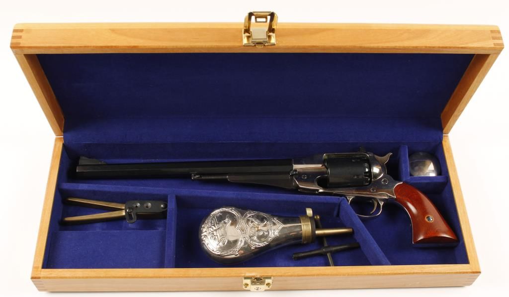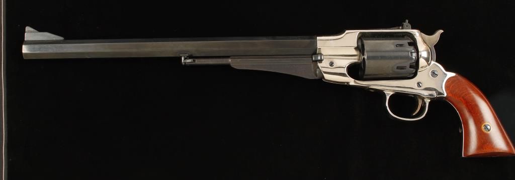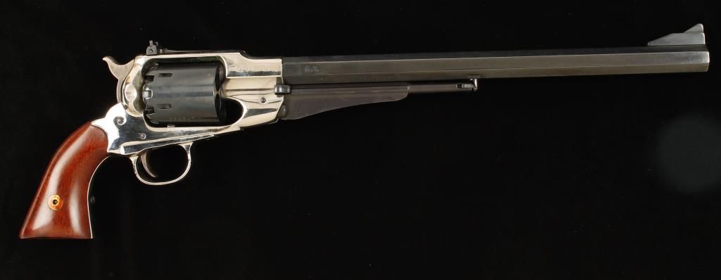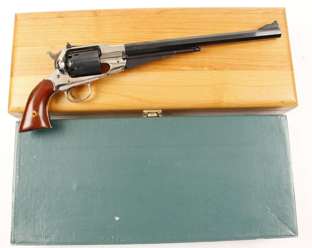 Cased and plated replica black powder single action 6-shot percussion pistol. Blued 12" octagon barrel and loading lever. Blued cylinder. Nickel plated non-ferrous frame (with adjustable rear sight) and trigger guard. Not cut for a shoulder stock. Lined hardwood case with loading and maintenance tools and a key. Includes the factory box with documents. Condition is like new in box. *Antique Firearm*