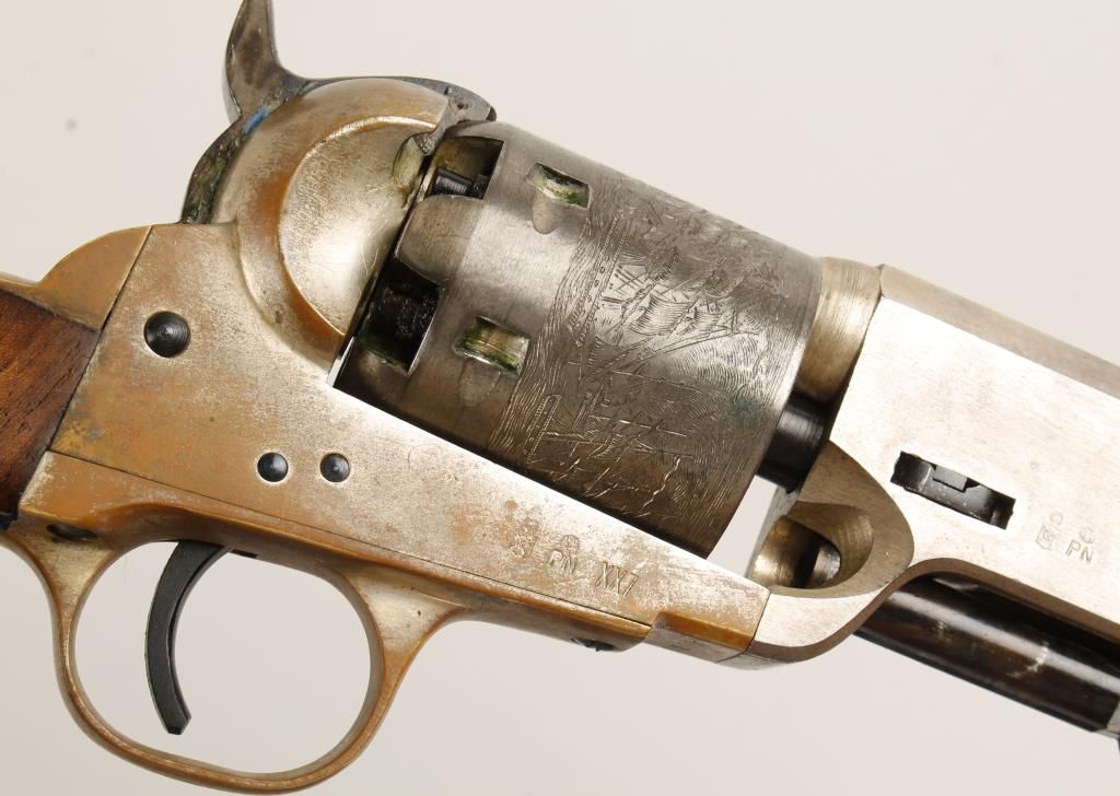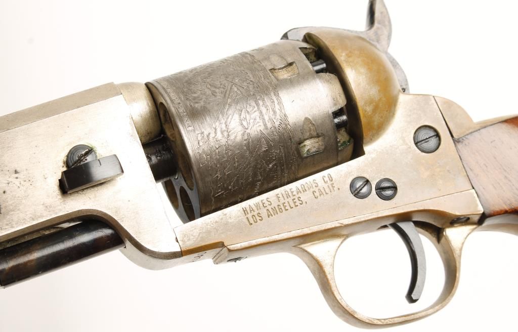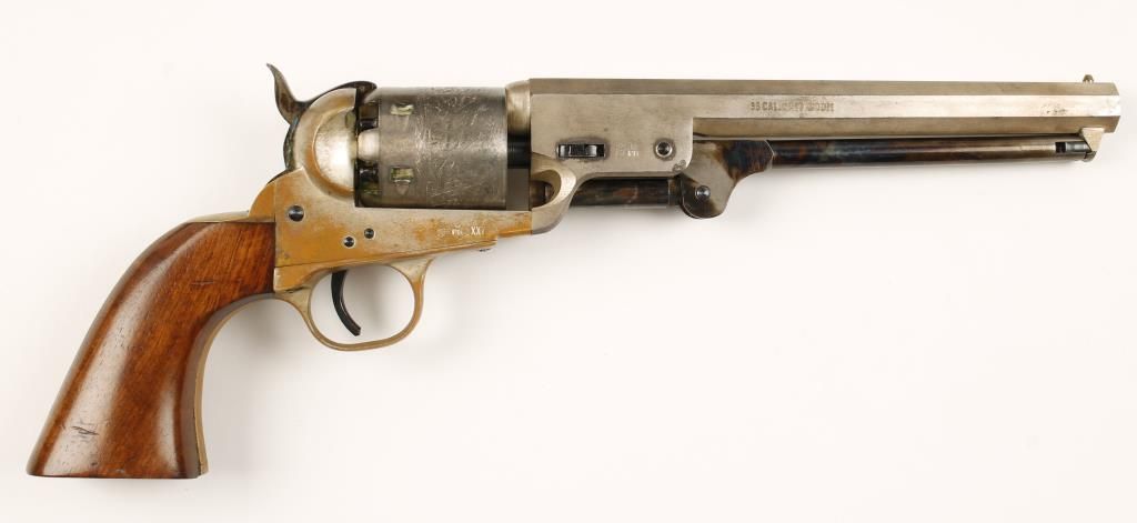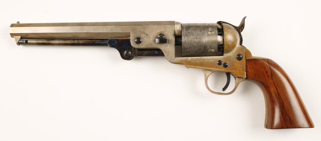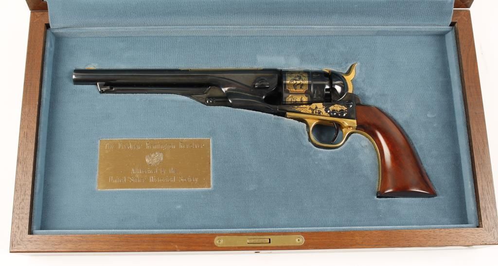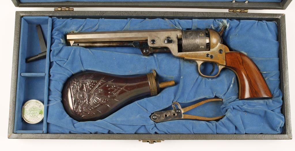 Cased commemorative 100th anniversary replica black powder single action 6-shot pistol. 7-1/2" in-the-white octagon barrel. Case colored loading lever and hammer. Grayed cylinder with engraving showing a naval engagement. Non-ferrous brass plated metal frame, trigger guard and backstrap. Not cut for shoulder stock. Comes in imitation leather wrapped case with royal blue velvet and includes a bullet mold, powder flask, nipple wrench and cap box. Lining is worn in spots, there is damage to the outside of the box and the hinges have been repaired with oversize screws. Stamped "Fort Sumter, April 12, 1861" on the barrel and the lid. Condition is fair. *Antique Firearm*
