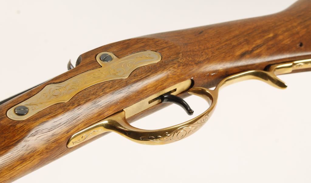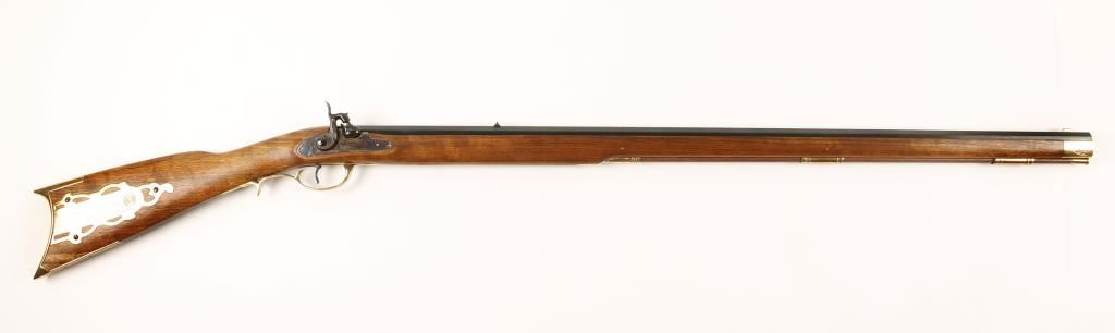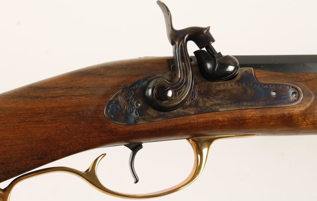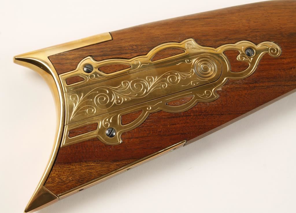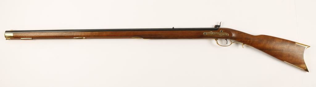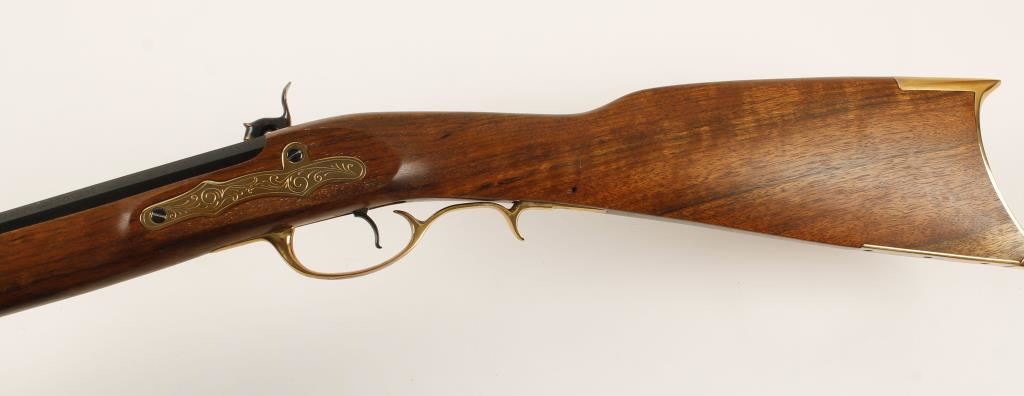 Engraved full stocked reproduction percussion Kentucky rifle in .50 caliber. Features a 35" blued octagonal barrel, brass front sight, engraved brass fixtures, brass patch box, case hardened lock & hammer and one piece full length wood stock. Engraved by Jim Downing "The Gun Engraver". Condition is like new in box. ***Antique Firearm***