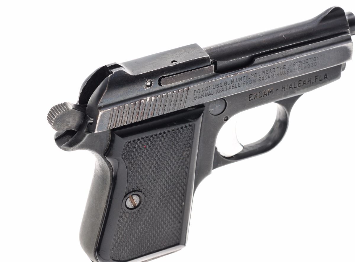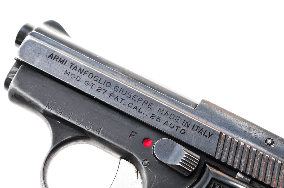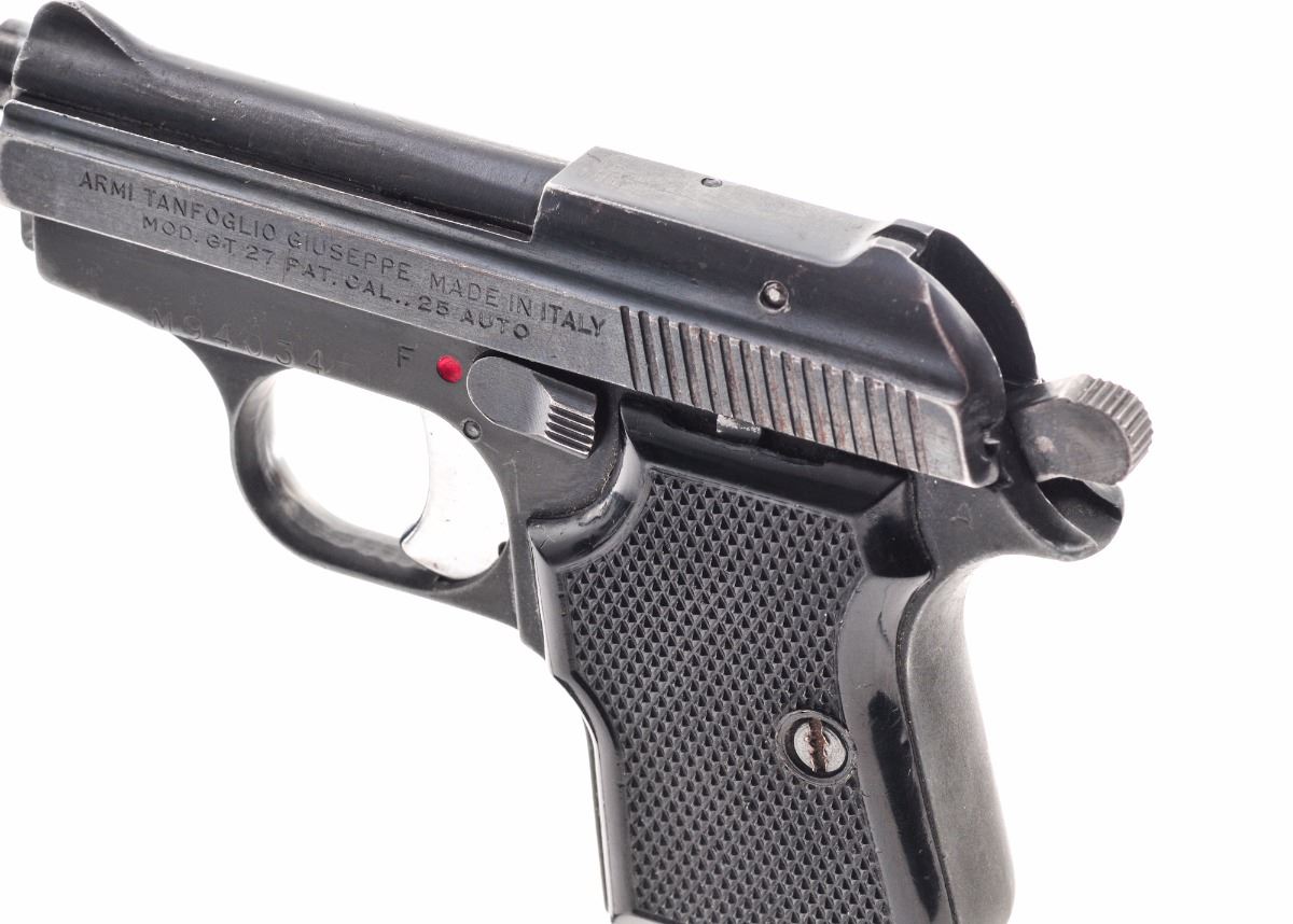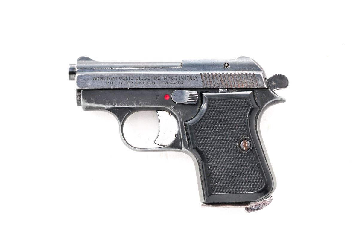Armi Tanfoglio Model GT 27 Semi-Automatic Pistol, #M94034, .25 ACP cal., 2.5'' barrel, blue finish, checkered black plastic grips, blade front sight and square notch rear sight, with one magazine. Import marked ''Excam-Hialeah, Fla.'' Condition is very good retaining approx. 85% original finish with slight loss at muzzle. Action is tight, bore is bright with slight frosting. Est.: $100-$250. (Modern) (Not available to Calif. residents.)