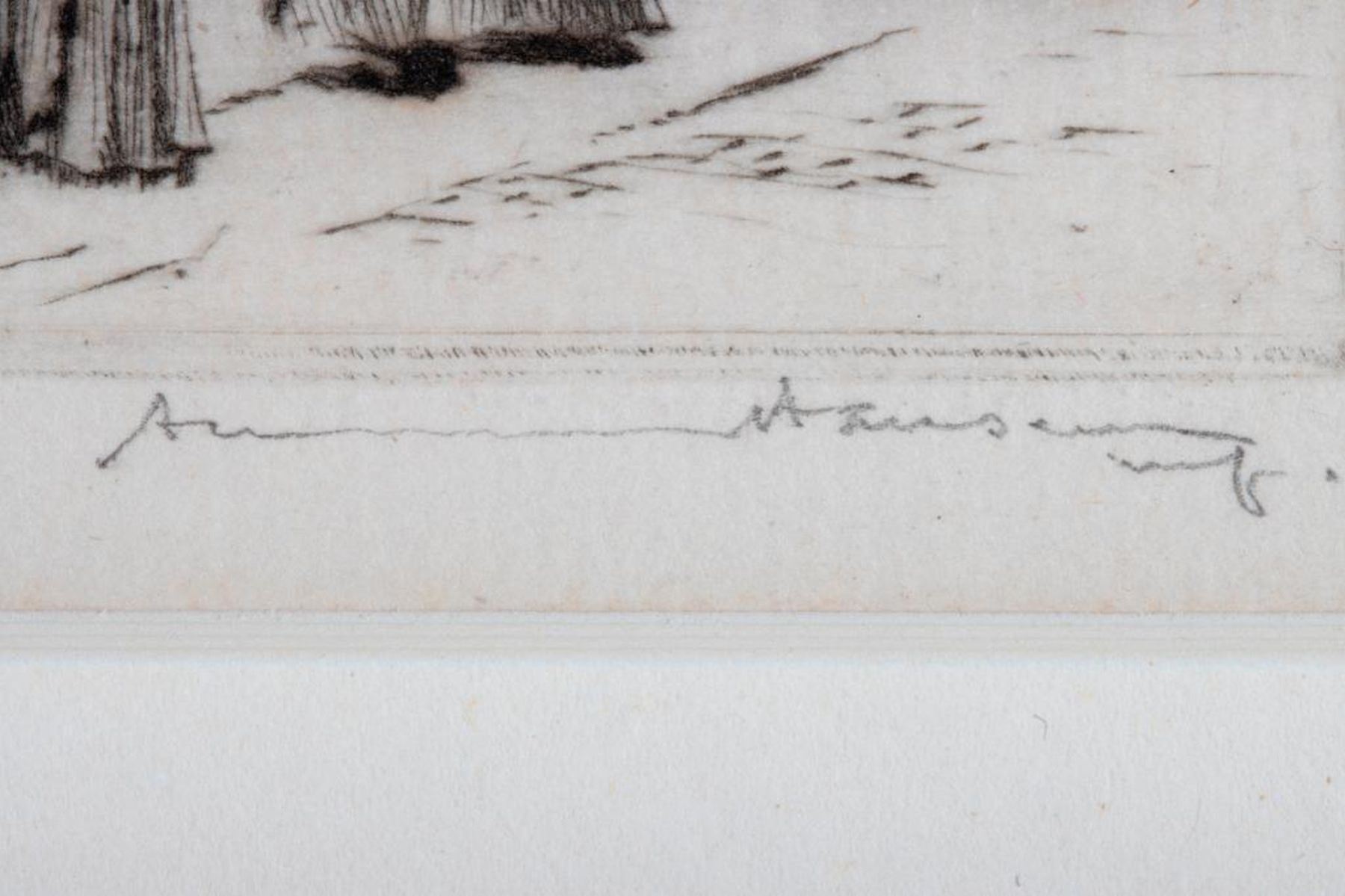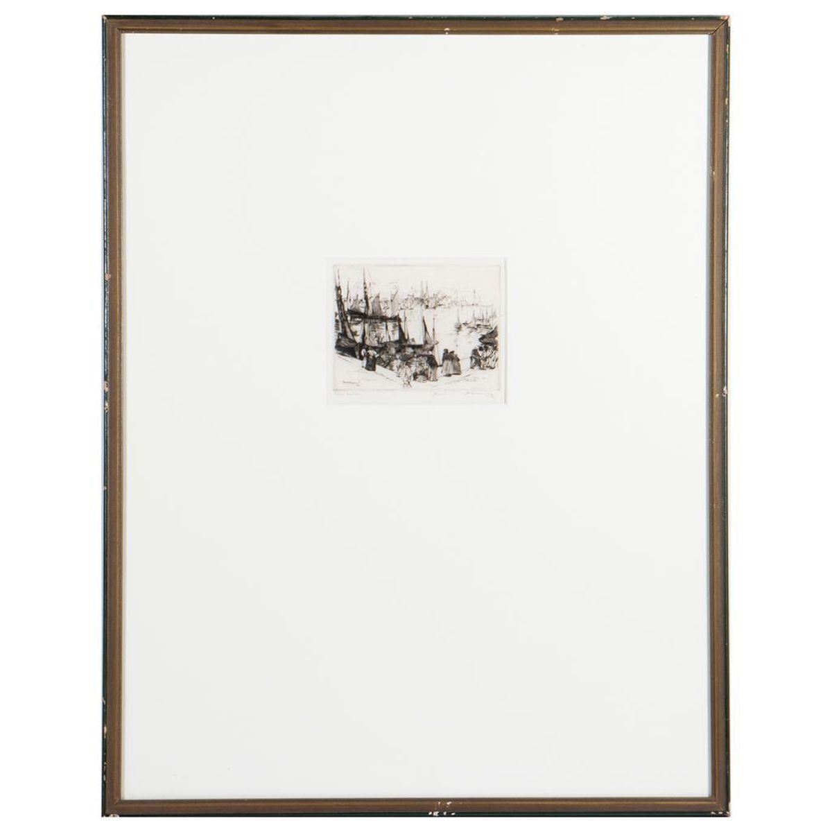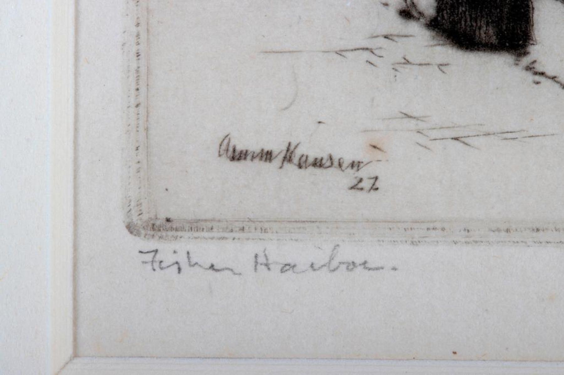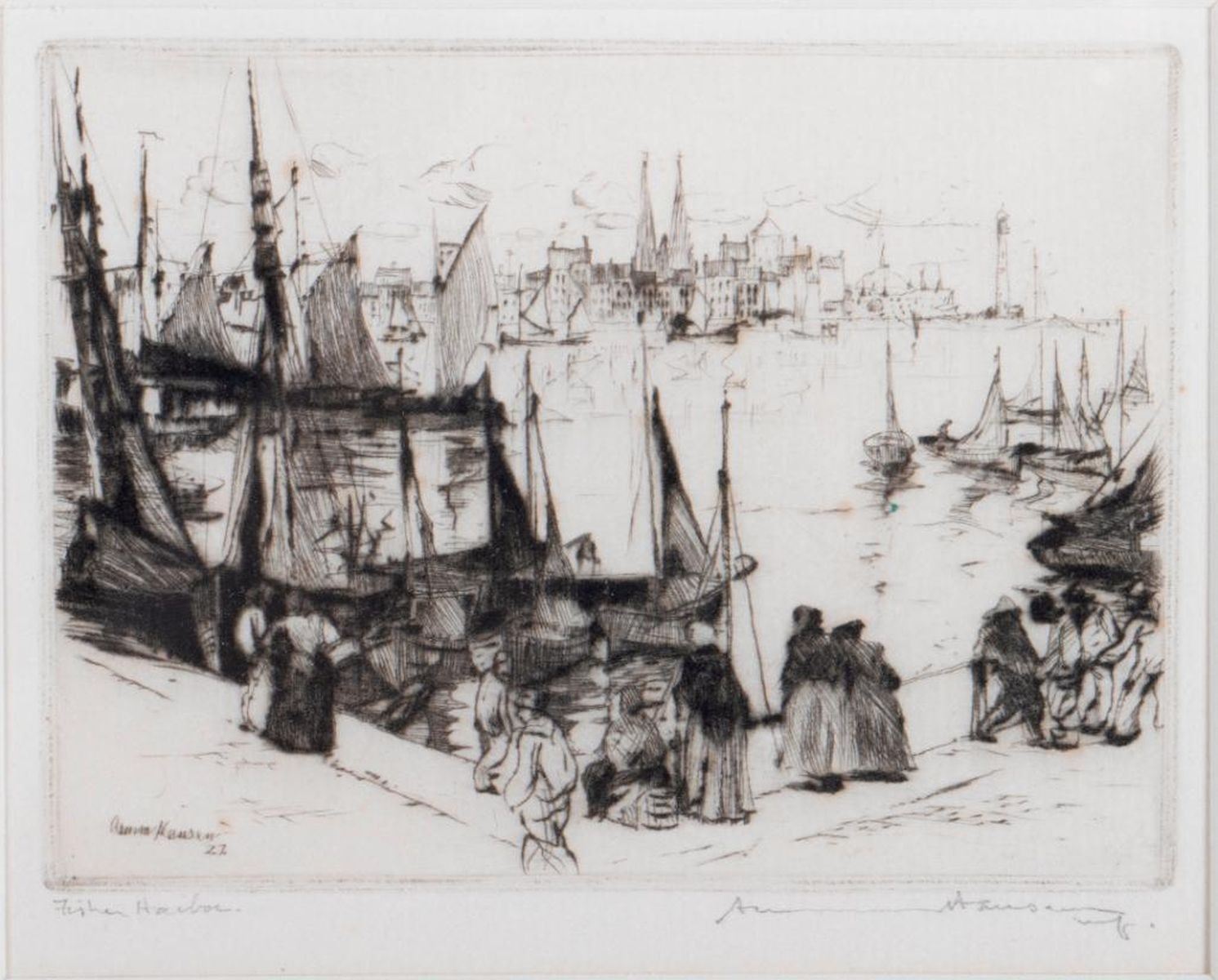 Artist: Armin Carl Hansen (1886 - 1957). Title: Fisher Harbor. Signature: Lower right. Size: 3" x 4". Medium: Etching.